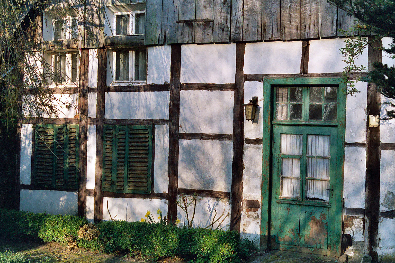 Die Fachwerk-Rückseite mit den merkwürdigen Fenstern im Obergeschoss - geteilt durch den horizontalen Balken des Giebeldreiecks.