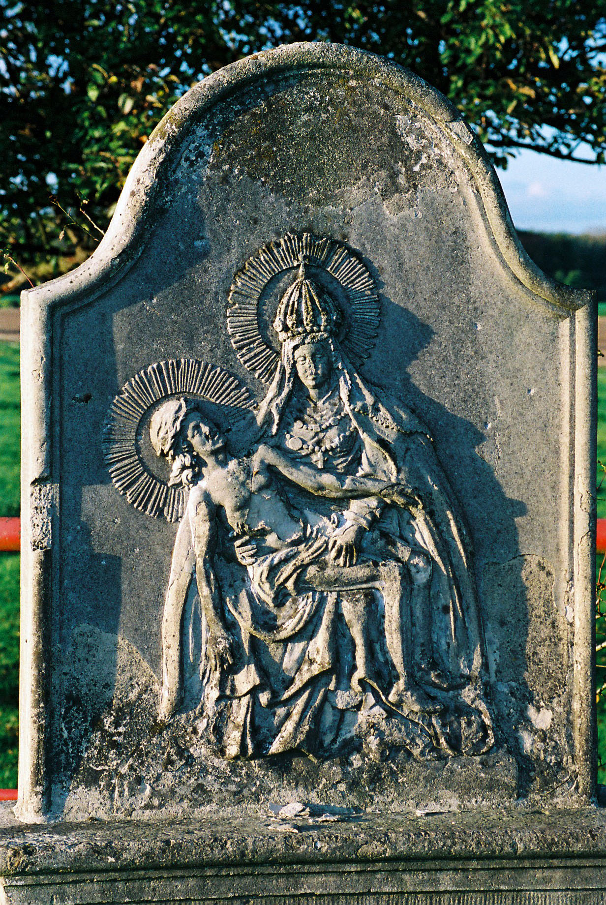 Die Mutter Gottes in weitem Umhang mit Krone und Strahlenkranz hält ihren halbsitzenden, verstorbenen Sohn, ebenfalls im Strahlenkranz, auf dem Schoß in Anlehnung an das Gnadenbild in Telgte. Ähnliche Auffassungen von der Pietà finden sich in den Bildstöcken