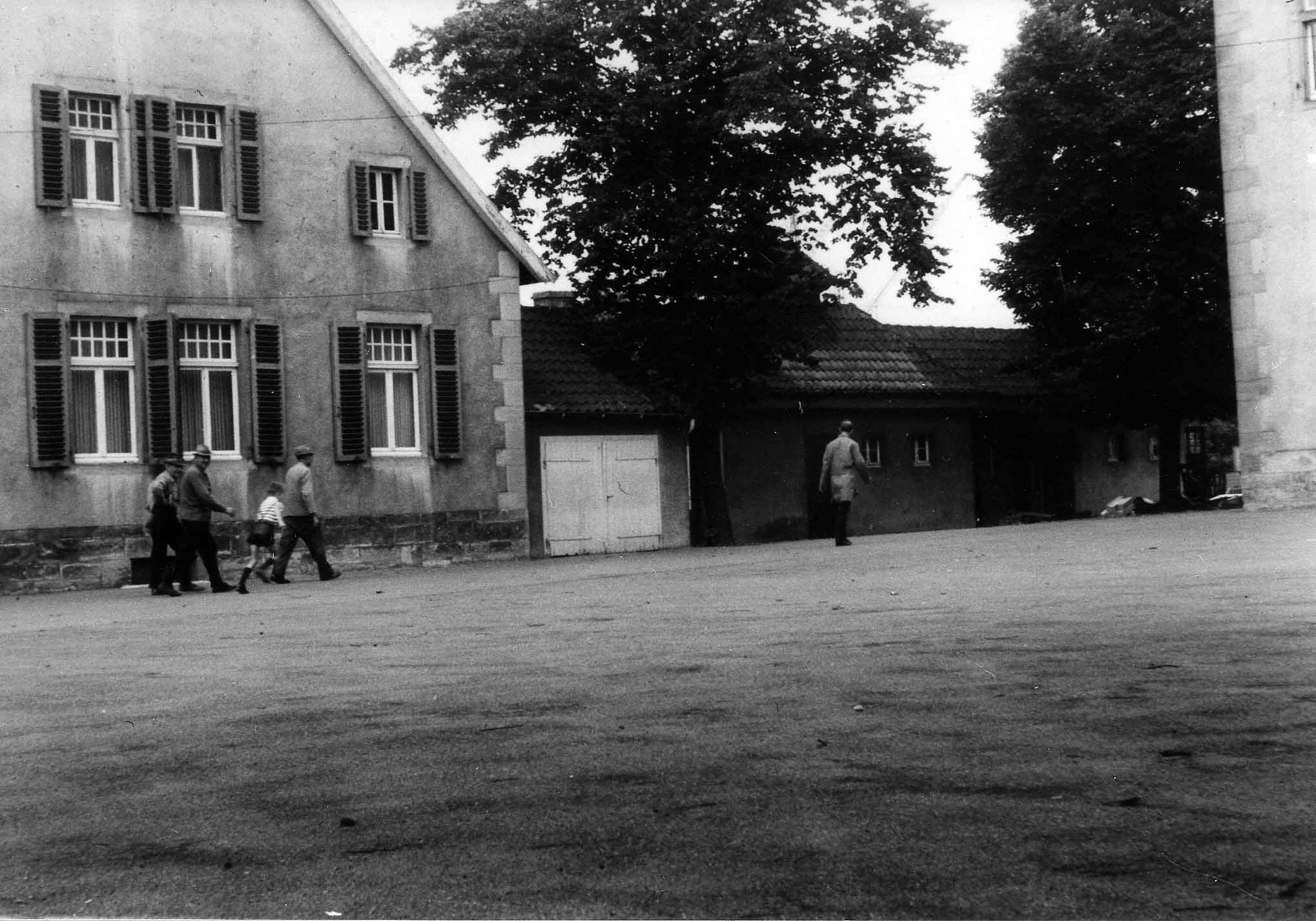 1970? : Schulhof der Volksschule um ca. 1970 Links das Wohnhaus der Lehrer, rechts die Schülertoiletten vor dem Abbruch. Nach dem Abbruch der Gebäude wurde hier die Festhalle gebaut.