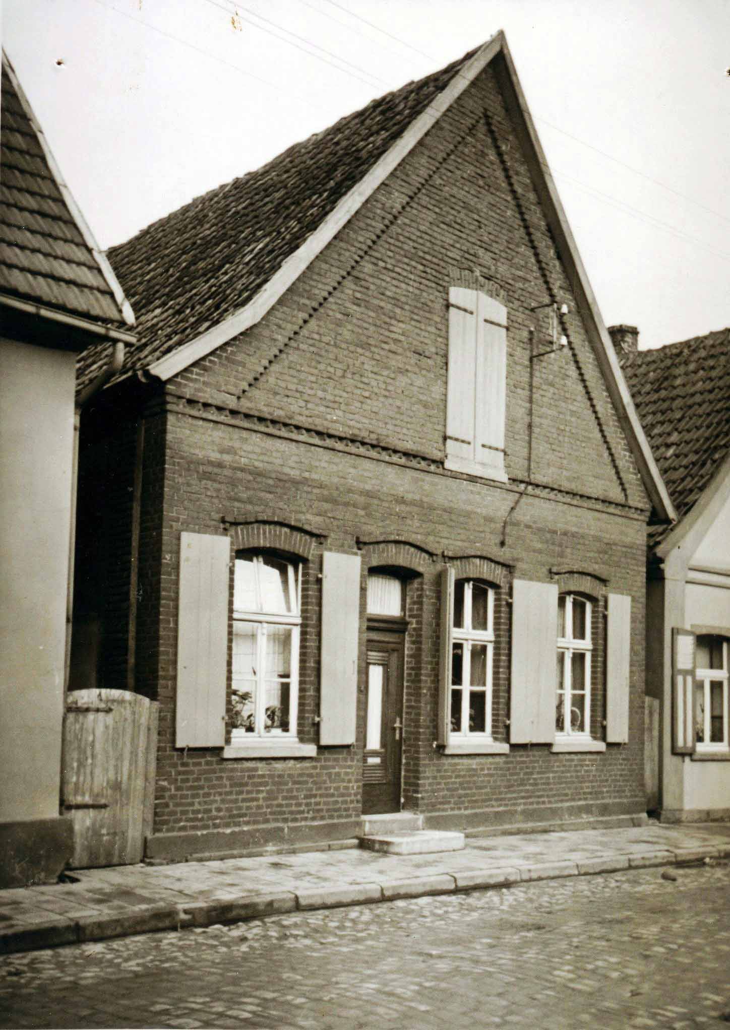 Das Haus hat eine Ladetür im Giebeldreieck. Der Elektroanschluss ist eine 2-adrige Freileitung. Das Straßenpflaster besteht am Rand aus Kieselsteinen.