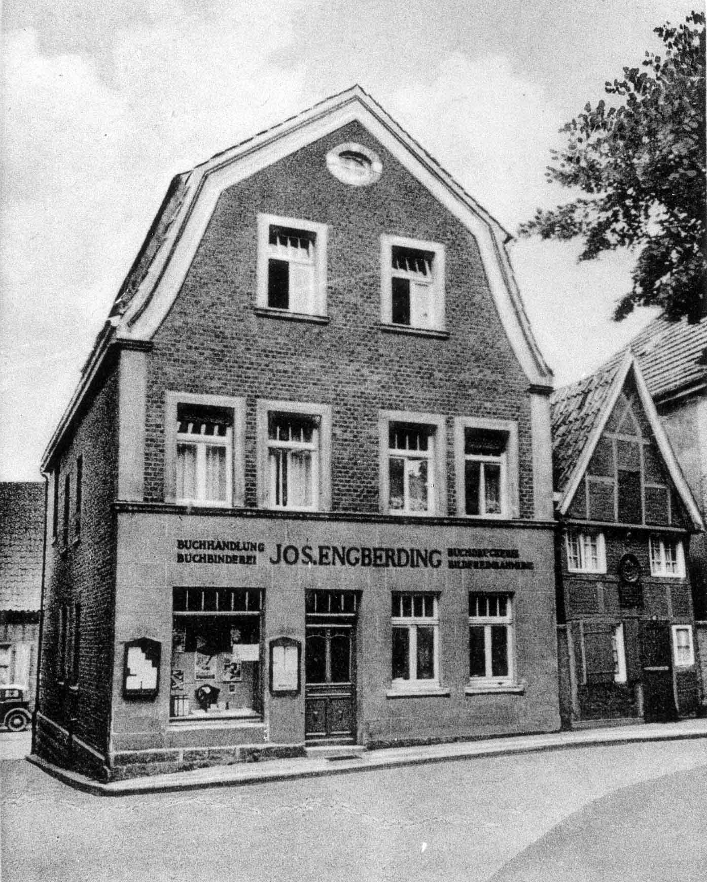 Das Haus ist aufgestockt und im Erdgeschoss verputzt. Schriftzug: Buchhandlung Buchdruckerei  Buchbinderei Bildereinrahmungen Jos. Engberding