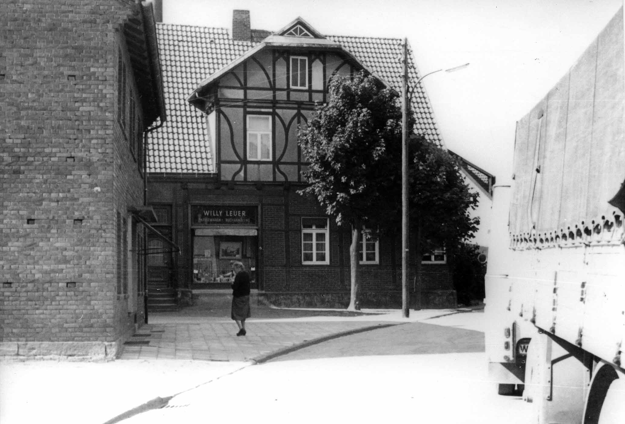 1962? : Fachwerkhaus Nordstraße 32 kurz vor dem Abbruch Schriftzug über dem Schaufenster: Willy Leuer, Papierwaren, Buchhandlung