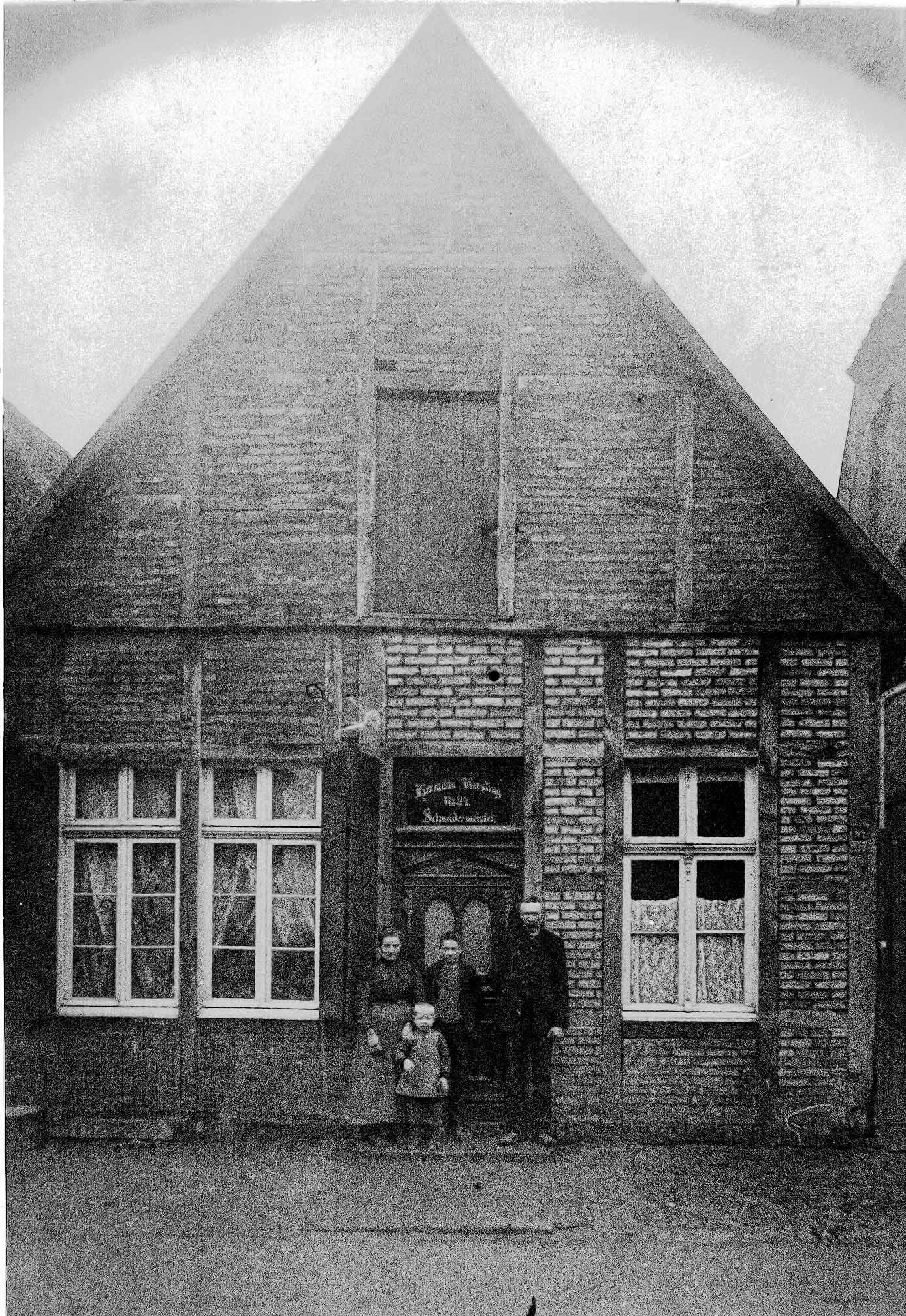 Das Haus hatte damals drei gleiche Fenster. Im Giebeldreieck eine Ladetür. Es steht ein Bottich unter dem Regenfallrohr.