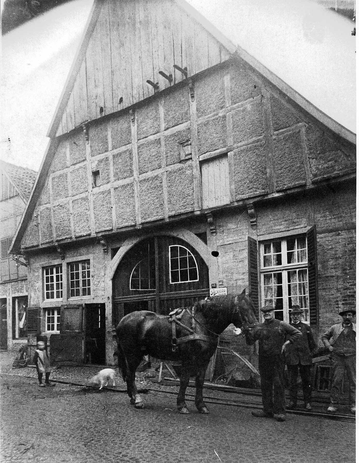 1910? : Vitusstraße 89 Fachwerkhaus mit Wohnhaus und Schmiede der Familie Jansen Personen von links: Heinrich Jansen, etwa 4 Jahre alt Großvater Heinrich Jansen, Schmiedemeister H. Lackmann und ein Postkutscher