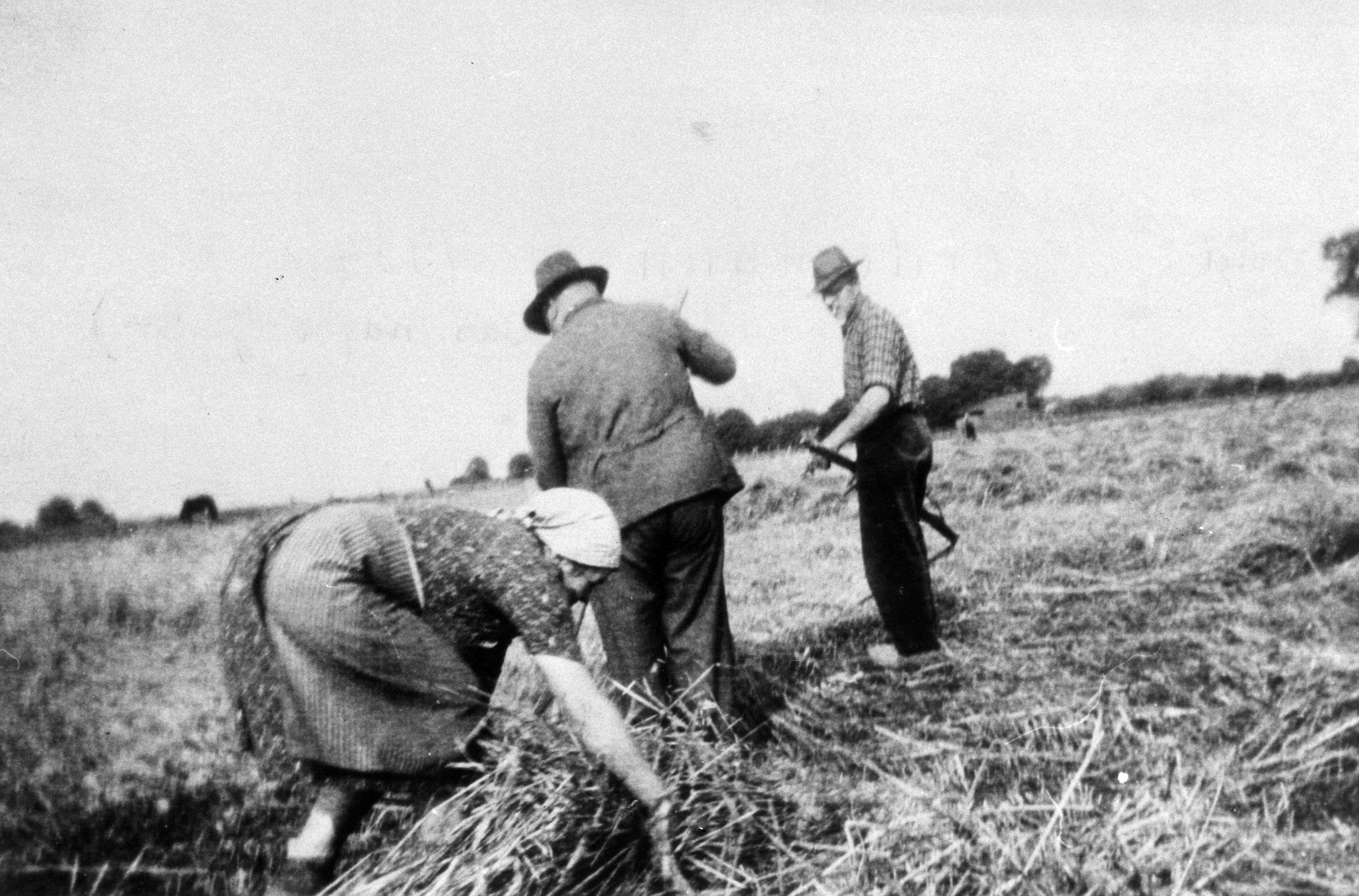 1954 : Getreideernte in Versmar auf einem Feld vom Hof Gerdemann, Versmar 4 Das Korn wird mit der Sense geschnitten, zu Garben zusammengenommen und mit einem Strick gebunden. Personen von links: Maria Gerdemann Bernhard Bußmann Heinz Klümper