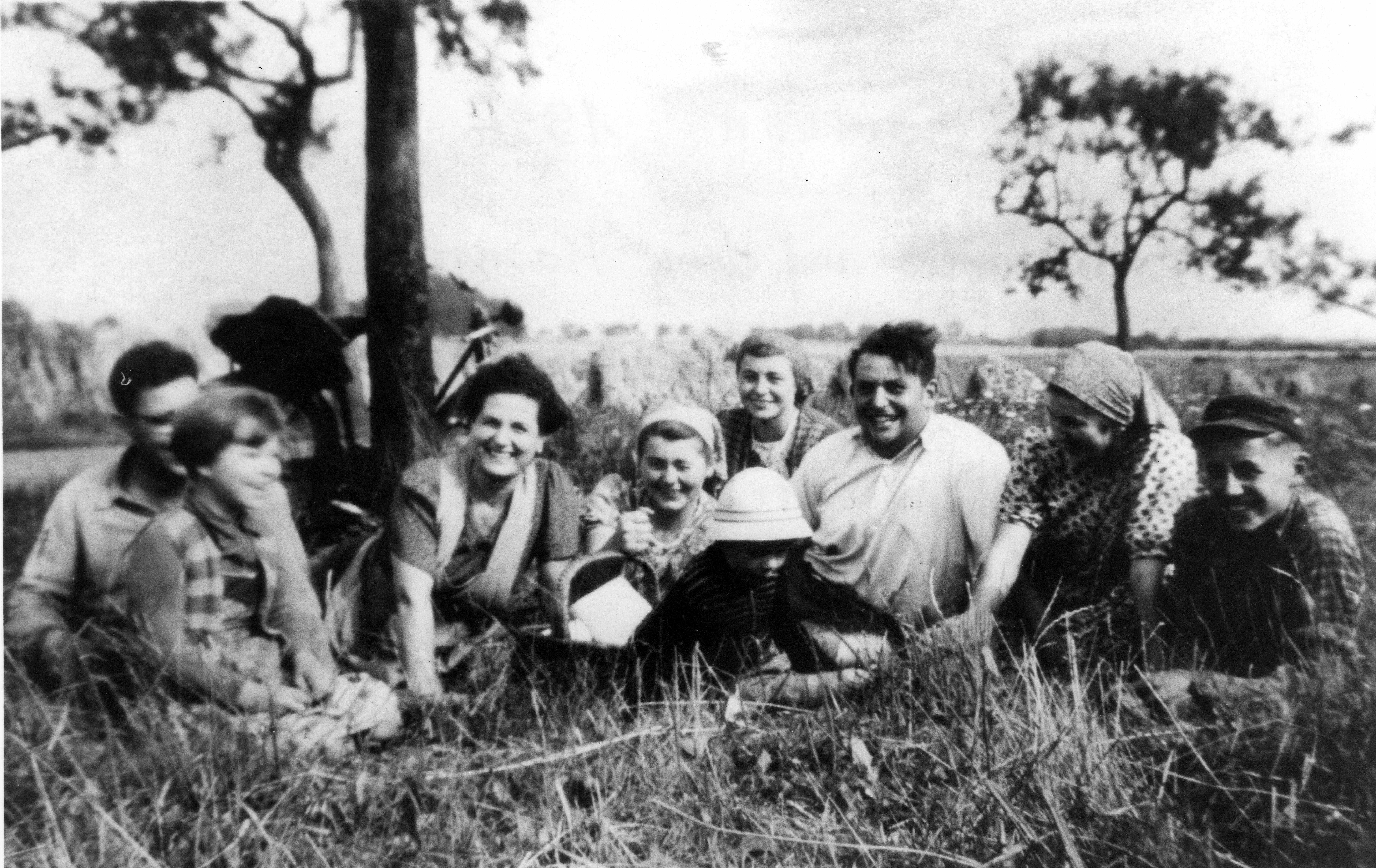 1954 : Frühstückspause auf dem Feld Personen von links: Julius Wiesert Ute Wiesert ..?... (Frau) Wiesert Agnes Gerdemann Toni Gerdemann Paul Schoppmann Irmgard Gerdemann Josef Gerdemann In der Mitte ein Ferienkind