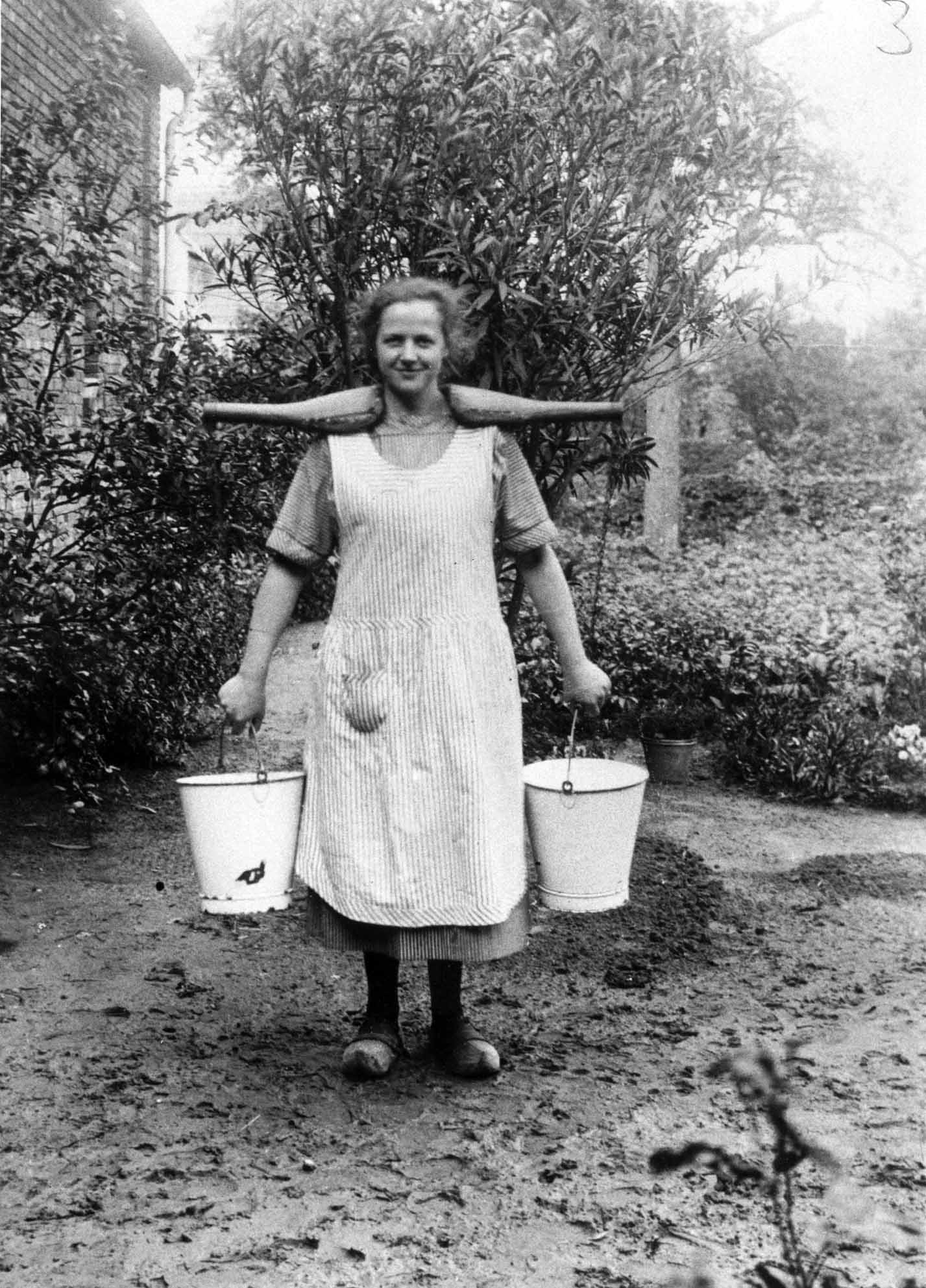 1922 : Nach dem Melken wurde die Milch in Eimern mit einem Joch von der Weide nach Hause getragen. Person: Änne Frohne, Vitusstraße