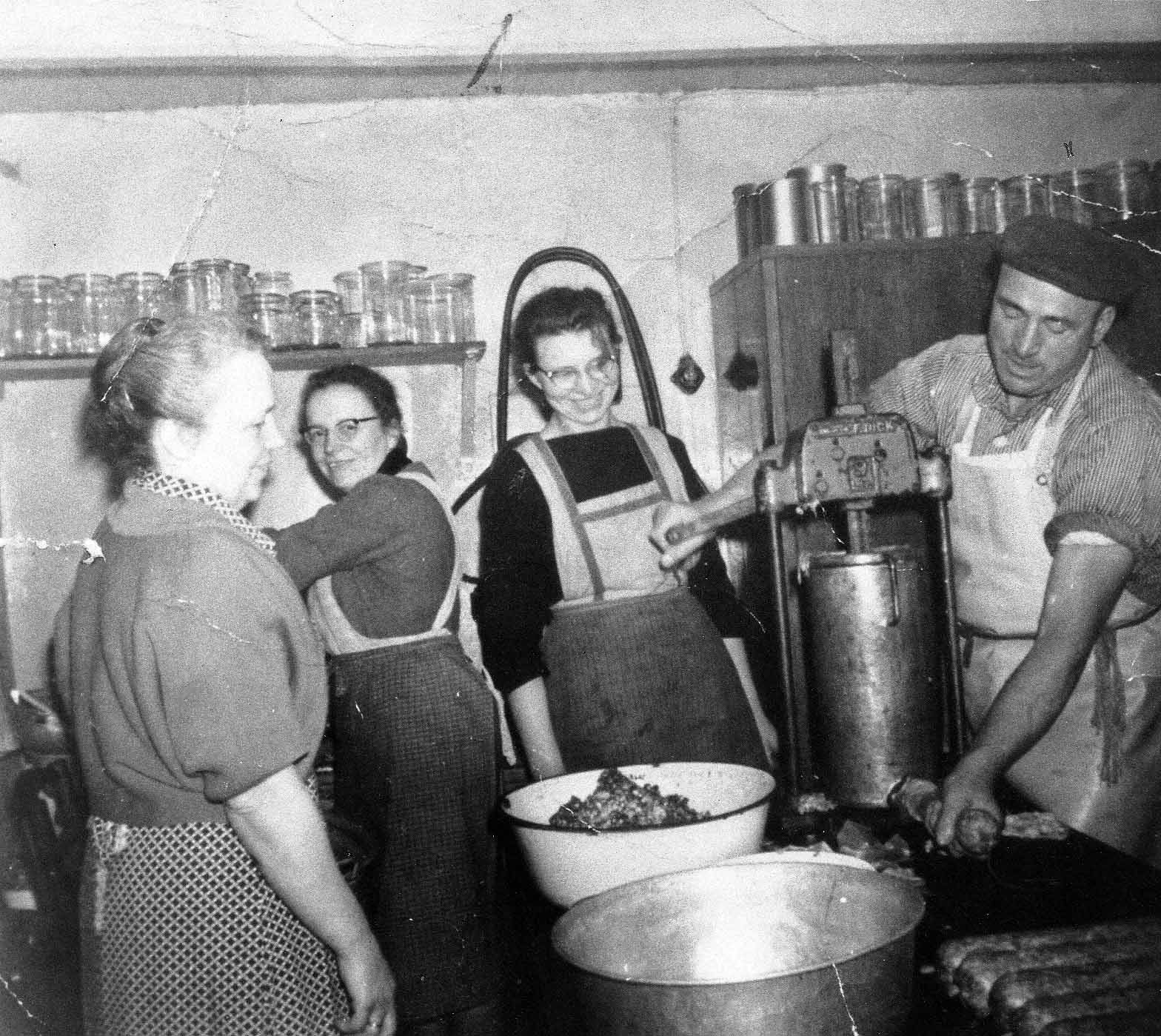 1956 : Hausschlachtung mit dem Metzger Wilhelm Märtens, Münsterstraße 6 Ort: Waschküche auf dem Hof Schulze Wemhove in Alverskirchen Personen von links: Frau Freitag, Frau Schulze Wemhove, Frau Sengenhorst Wilhelm Märtens