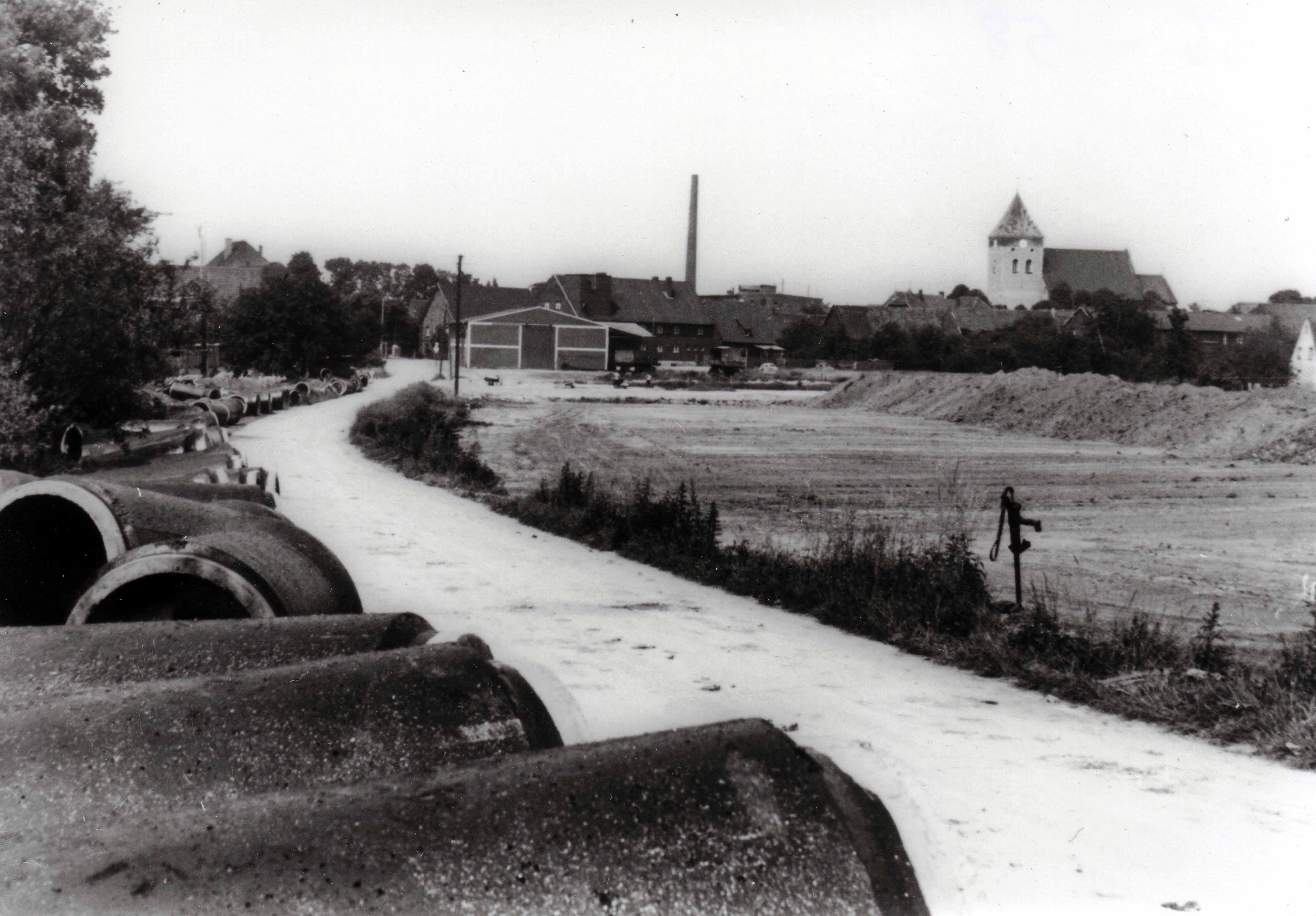 1966 : Die Erschließung des Baugebietes der Bauernsiedlung Links die Rohre für den Hauptsammler. Im Hintergrund die Gebäude der Bäuerlichen Bezugs- und Absatzgenossenschaft und der Schornstein der Molev. Vorne rechts eine Weidenpumpe.