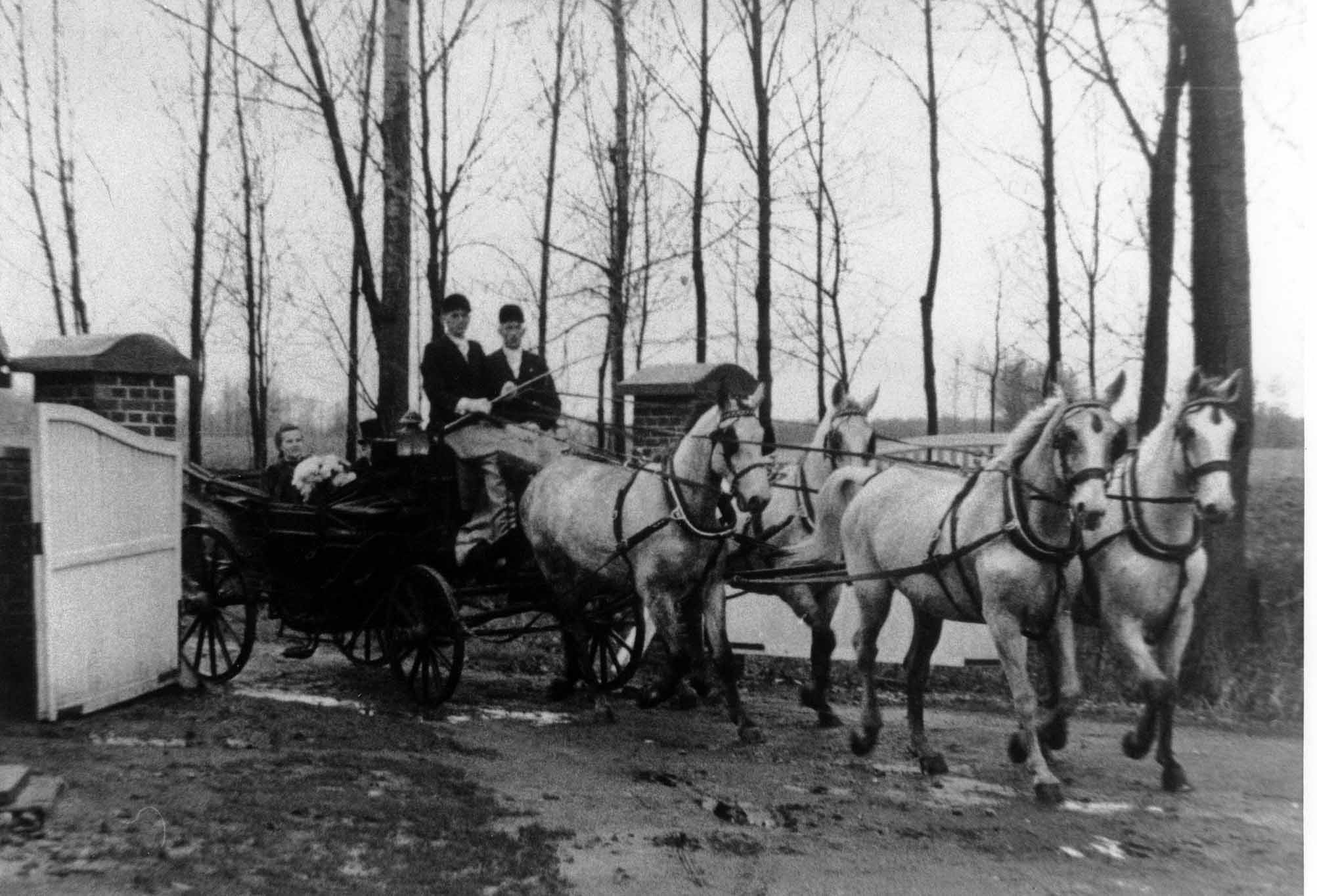 1947 : Vierspännige Kutsche auf dem Weg zur Hochzeit von Hugo und Mimmy Heitmann Personen von links: August Schulze Zurmussen, Müssingen Josef Cremannn, Müssingen