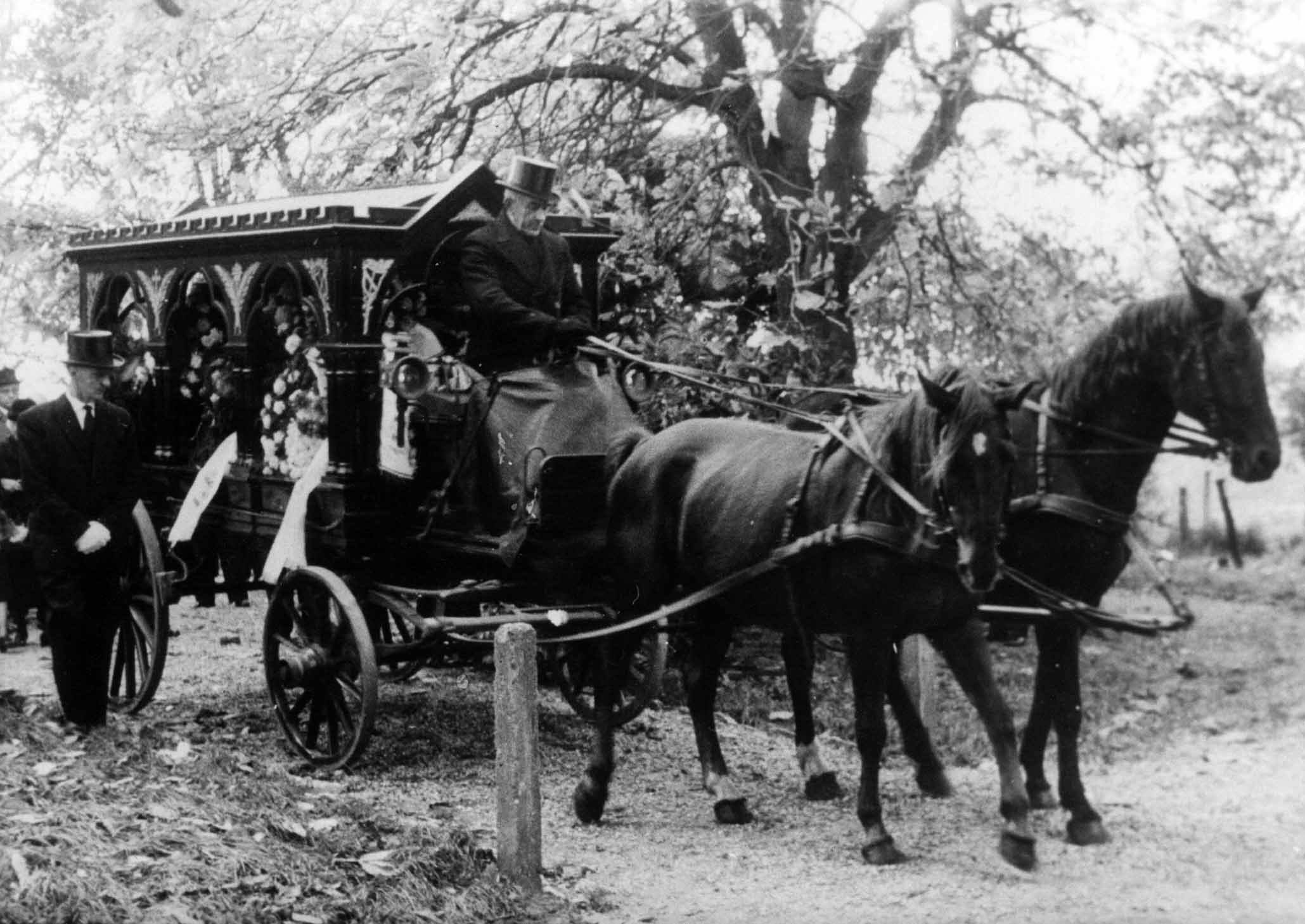 12.10.1963 : Der Leichenwagen aus Everswinkel mit dem Fahrer Bernhard Raumberg, Vitusstraße 9, auf dem Friedhof in Einen bei der Beerdigung von Herrn Pastor Meißen.