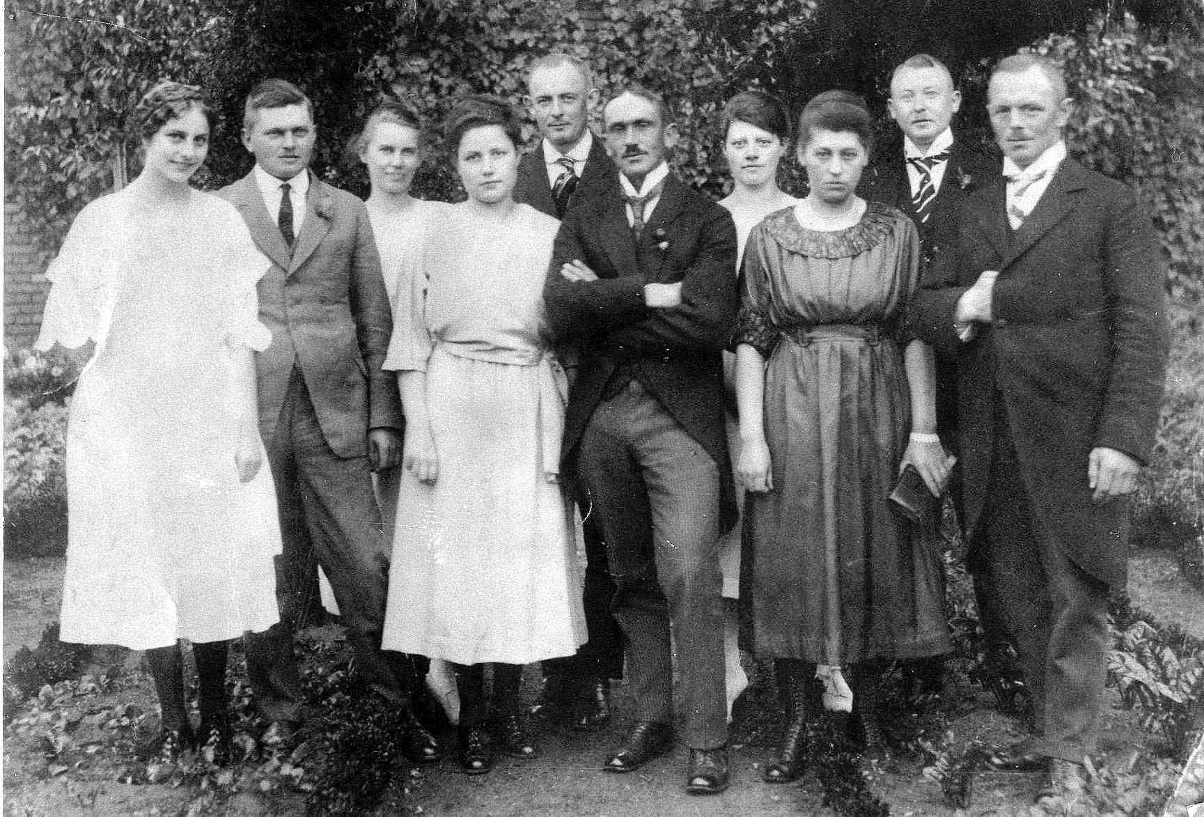 Der Hofstaat: von links: Maria Schulze Versmar, Josef Große Erdmann, Gertrud Kortmann, Königin Toni I. Schulze Zumhülsen, Julius Roberg, Schützenkönig Paul I. Suttorp, Maria Arning, Christine Große Winkelsett, Josef Middendorf, Karl Brinkmann