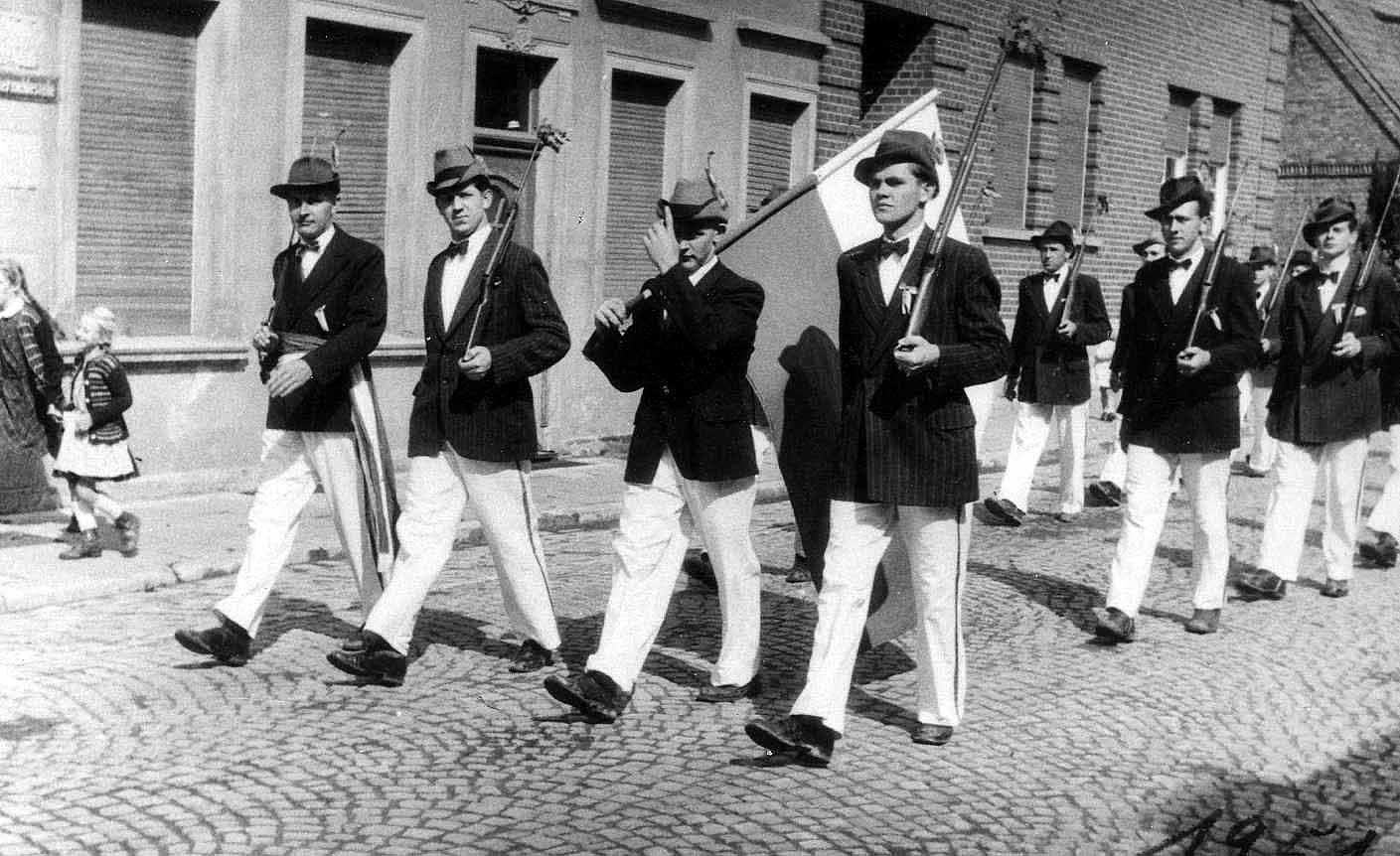 1951 : Rückmarsch nach dem Königschießen: Bernhard Abigmann, Leo Drees, Erwin Konitzer, Leo Kortenjann, Eugen Buntenkötter, Rudi Koch