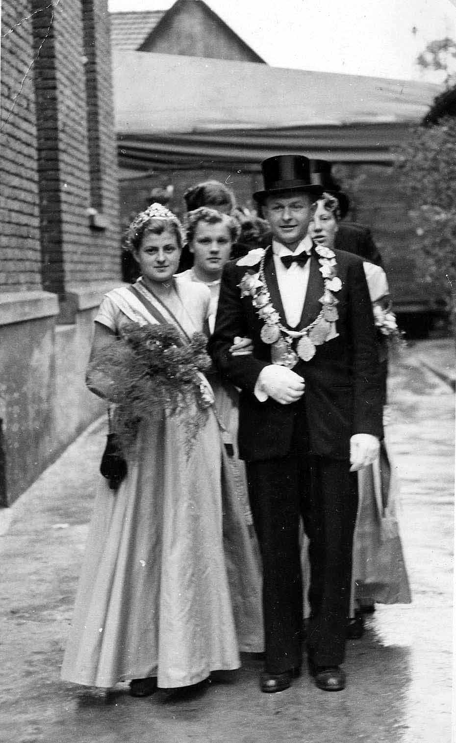 1954 : Schützenkönig Fritz I. Herding und Königin Hedwig I Averfeld mit Ehrendamen Heidi Suttorp und Hedwig Bornefeld im Hintergrund das Zelt im Hof der Gaststätte Mittrup