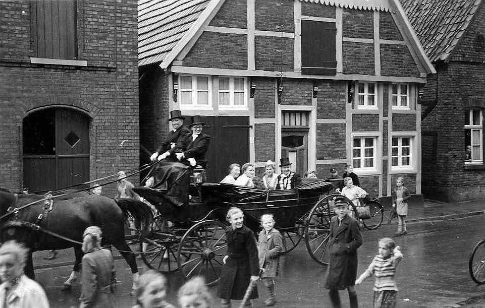 1954 : Königspaar mit Ehrendamen in der Kutsche auf der Nordstraße. Auf dem Kutschbock: Hermann Sendes und Willy Leuer
