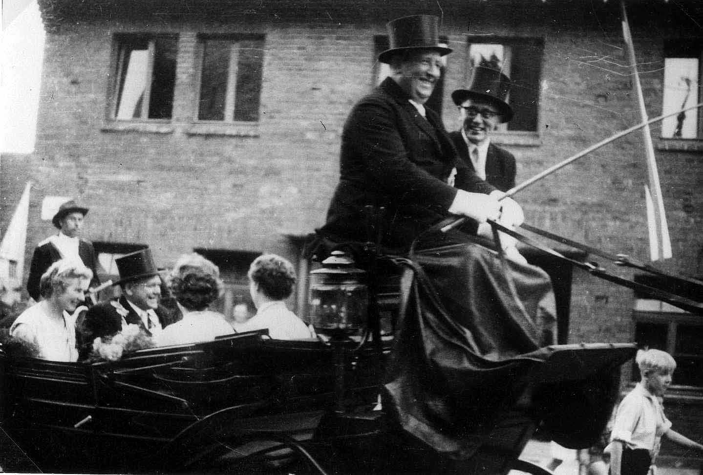 1956 : In der Kutsche: Schützenkönig Bernhard I. Beste und Königin Hedwig III. Schulze Tertilt Auf dem Kutschbock: Hermann Sendes, Willy Leuer