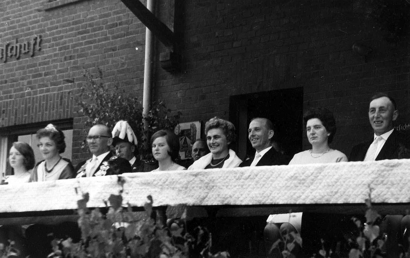 von links: Ehrendame Elisabeth Rotthege, Königin Margot I. Silling, Schützenkönig Karl IV. Deckenbrock, Hugo Heitmann, Ehrendame Maria Cremann, Willi Kemper, Irmgard Deckenbrock, Heinrich Silling, Hanna Kortmann, Heinrich Vienenkötter