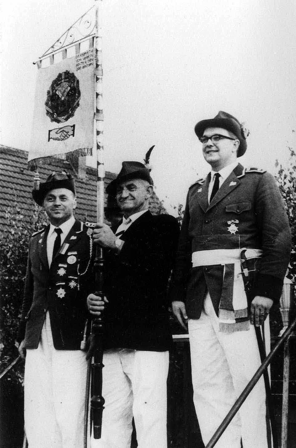 1966/67 : Die Ehrengarde hat die Kreisstandarte in Beelen errungen Im Bild von links: Felix Schulze Zurmussen, Vorsitzender Werner Schulze-Tertilt, Feldwebel Günter Homann