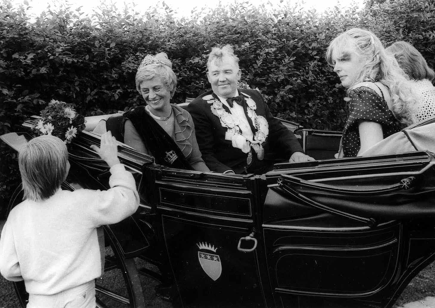 1982 : Schützenkönig Heribert I. Richter-Loermann, Königin Karin I. Schulze Zurmussen fahren nach der Krönung im offenen Landauer durch die Gemeinde