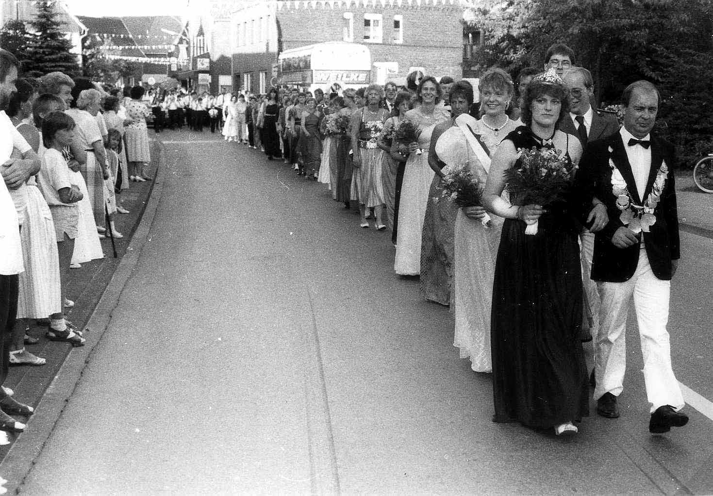 1987 : Die Polonaise angeführt von Königin Elisabeth II. Uennigmann und Schützenkönig Wolfgang I. Bradtke.