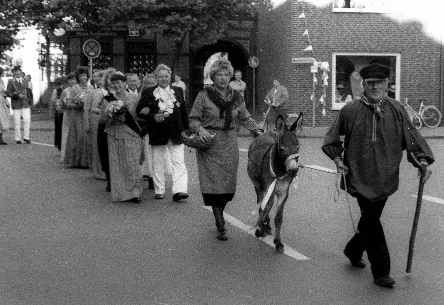 1989 : Polonaise 1989 mit Darstellung einer biblischen Geschichte: Maria und Josef zu Fuß unterwegs! Heinz Pellmann und Toni Rolf mit einem Esel führen die Polonaise an.