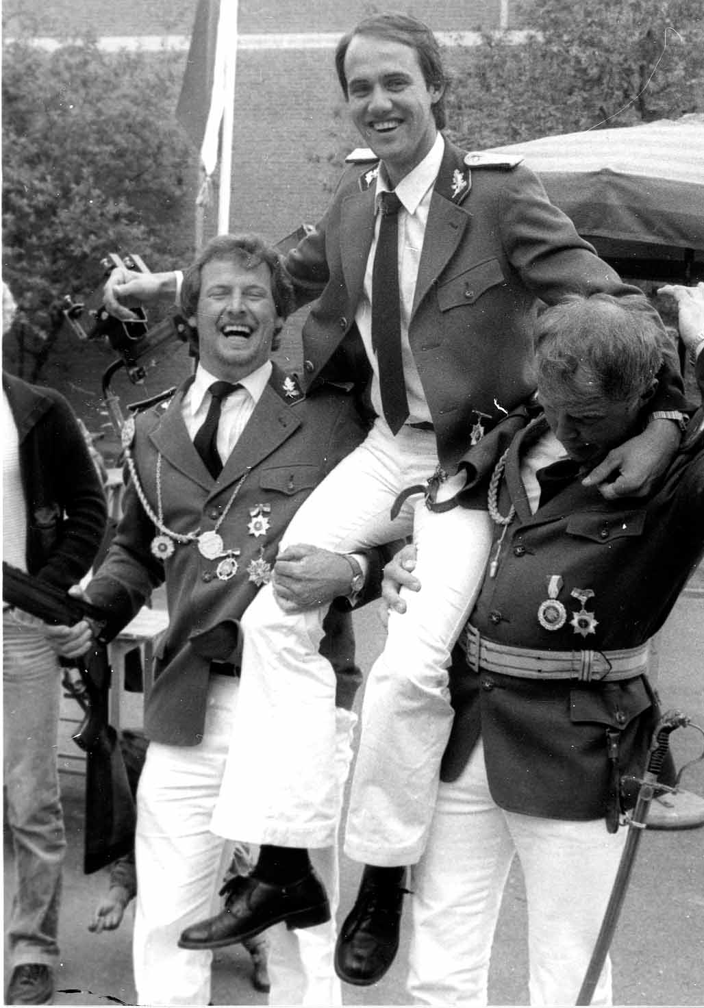 02.07.1984 : Hampelmannkönig Hugo Schlüter auf den Schultern von Heiner Roggenland und Josef Schwermann