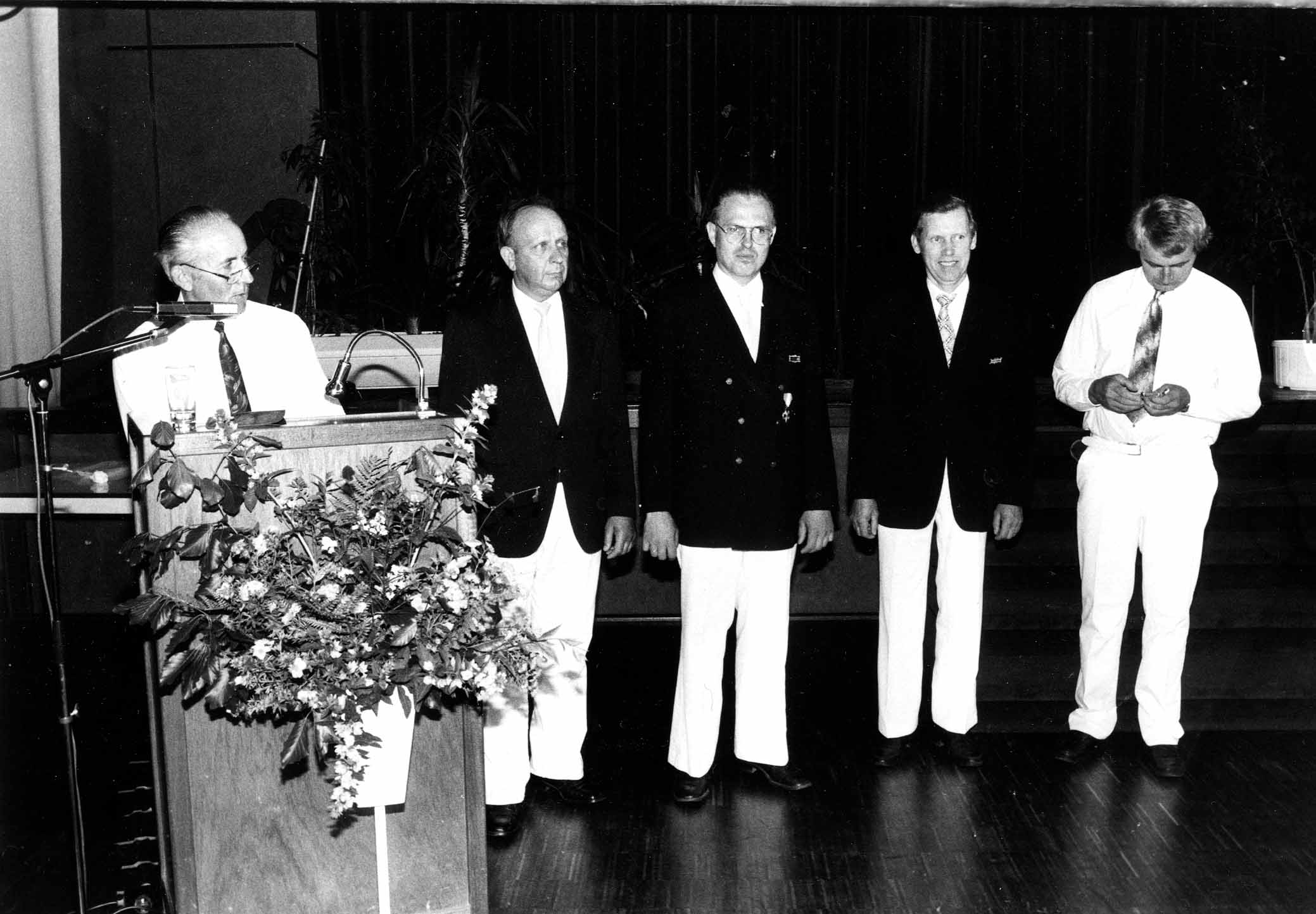 09.07.1991 : Ehrungen verdienter Schützenbrüder beim Frühschoppen von links: Vorsitzender Josef Gerdemann, Alfons Stetzkamp, Josef Schräder, Alfons Leuer, stellvertretender Vorsitzender Reinhard Schulze-Tertilt