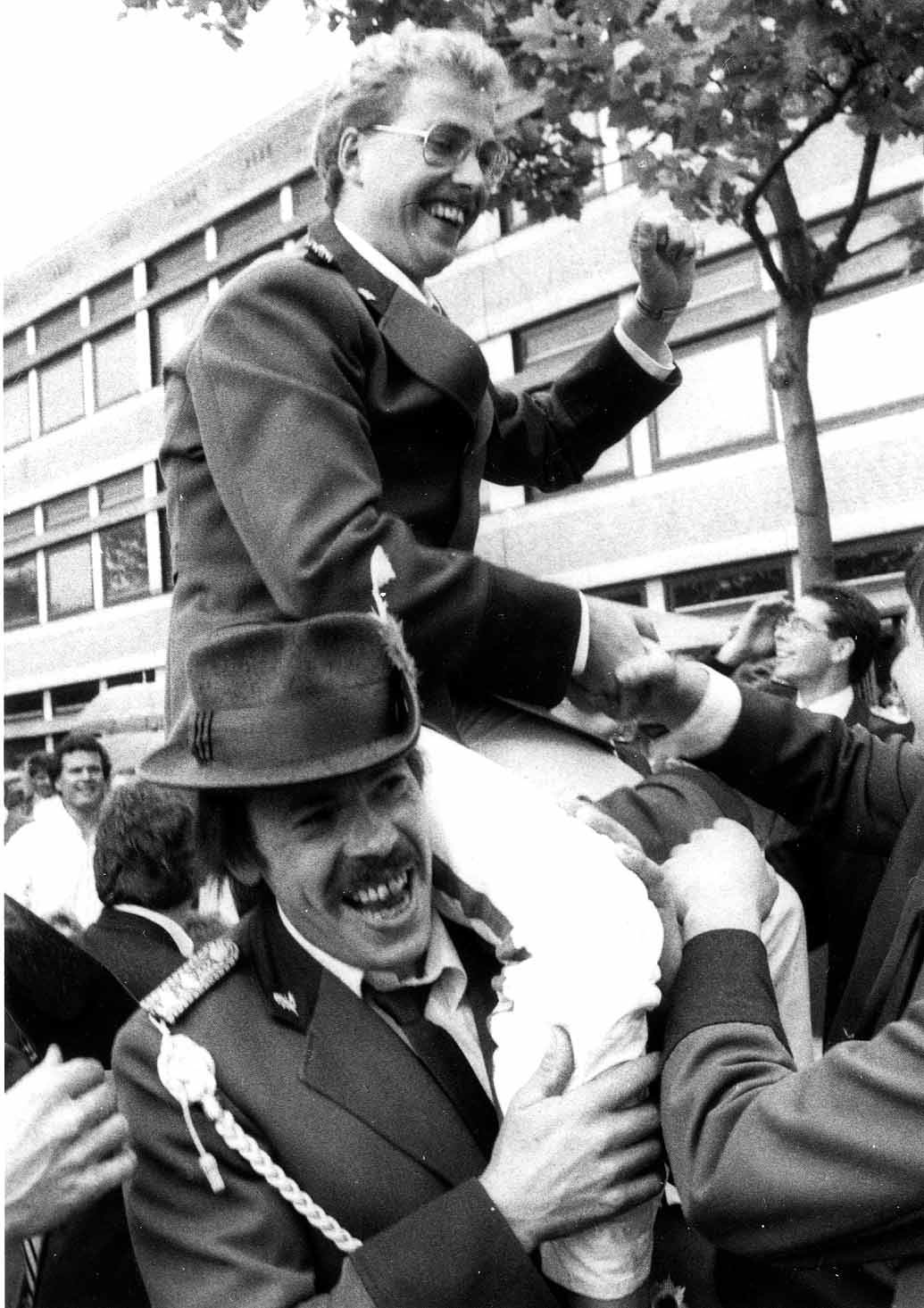 07.1988 : Neuer Schützenkönig Peter Friedrich auf der Schulter von Ludger Küdde.