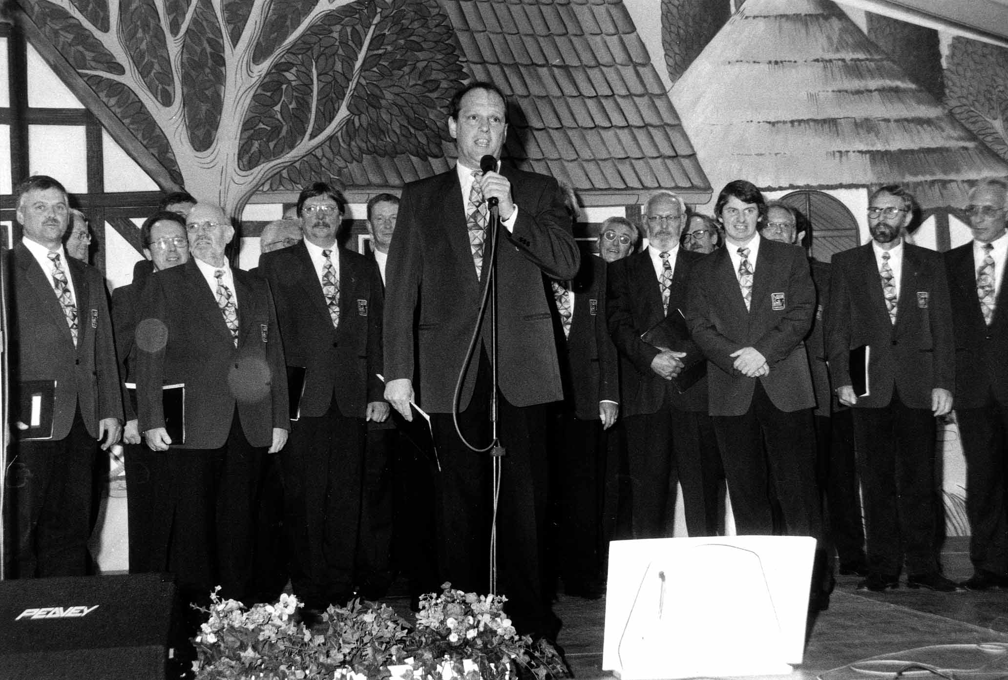 05.07.1997 : Der MGV beim Heimatabend mit Heiner Arning am Mikrofon und in der vorderen Reihe Reinhold Rottmann, Peter Sebulke, Wilfrid Mettelem, ... Heinz Braunsmann, Günter Blase.