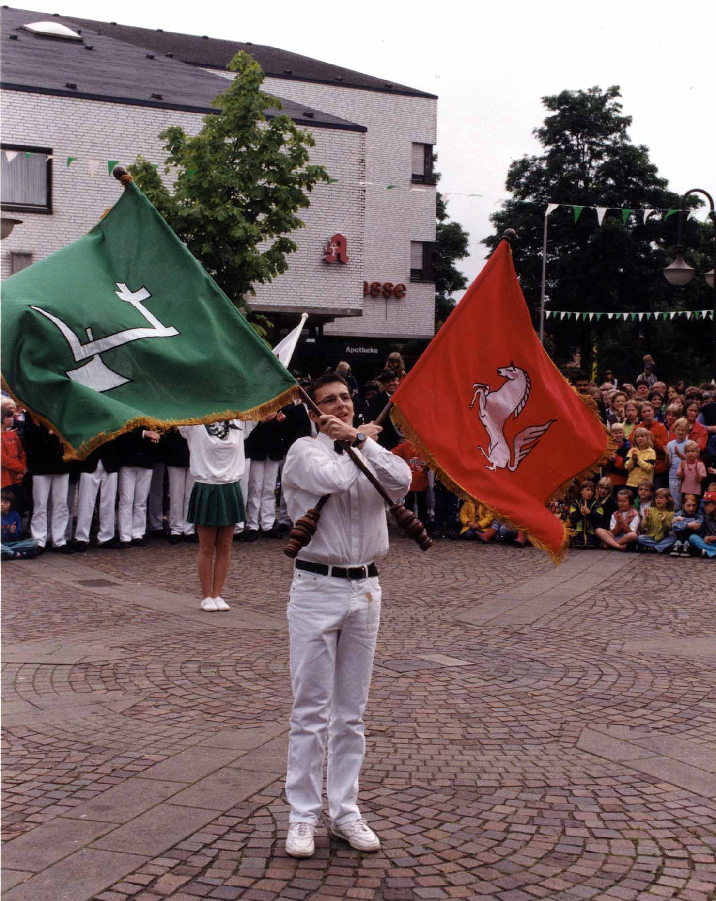 06.07.1998 : Die Fahnenschlaggruppe der KLJB während der Krönungsfeier; hier Frank Horstmann