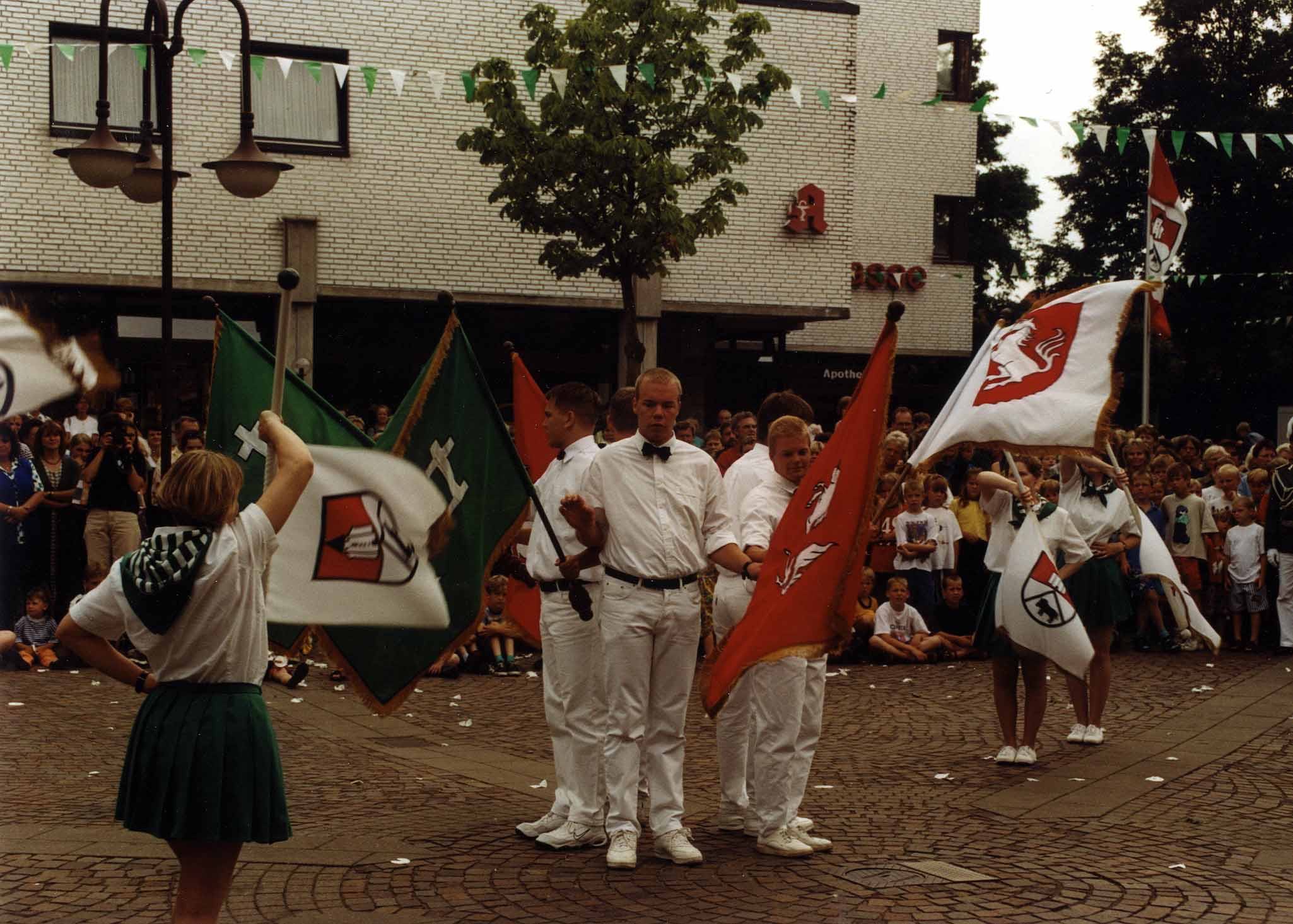06.07.1999 : Die Fahnenschlaggruppe der KLJB während der Krönungsfeier