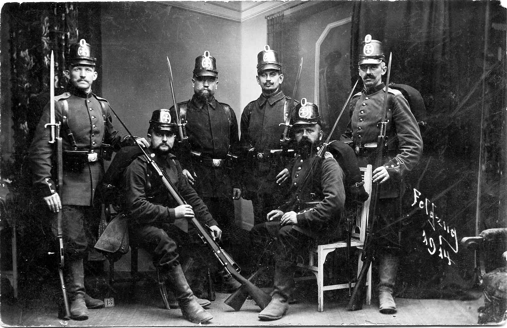 01.10.1914 : Feldpostkarte vom 1. Oktober 1914 mit sechs Soldaten in Ausgeh-Uniform. Auf dem linken Stuhl sitzt H. Geßmann