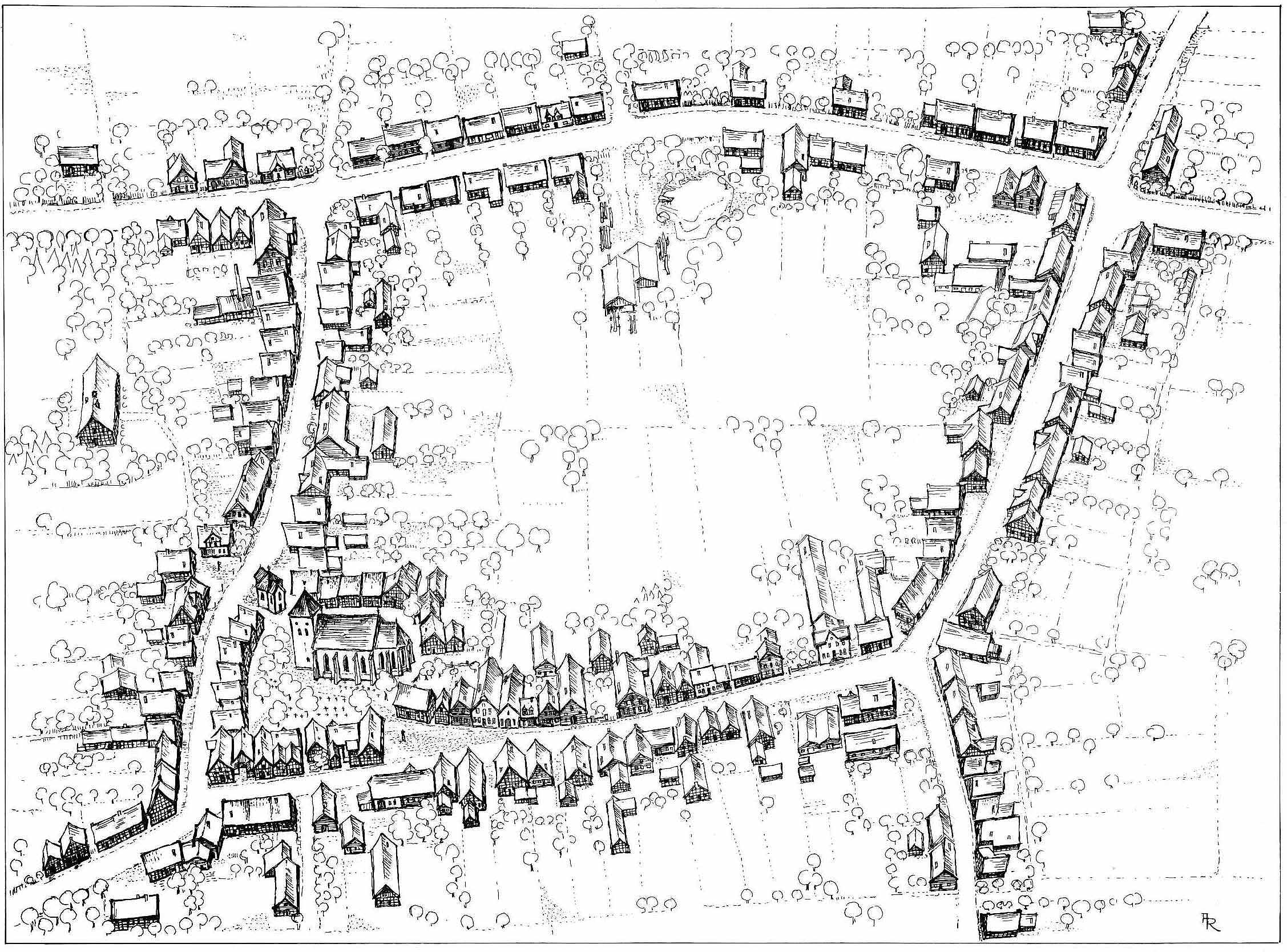 Das Dorf nach einer Karte von 1906 gezeichnet aus der Vogelperspektive Federzeichnung für das Buch "Dörfer im Wandel", 1987