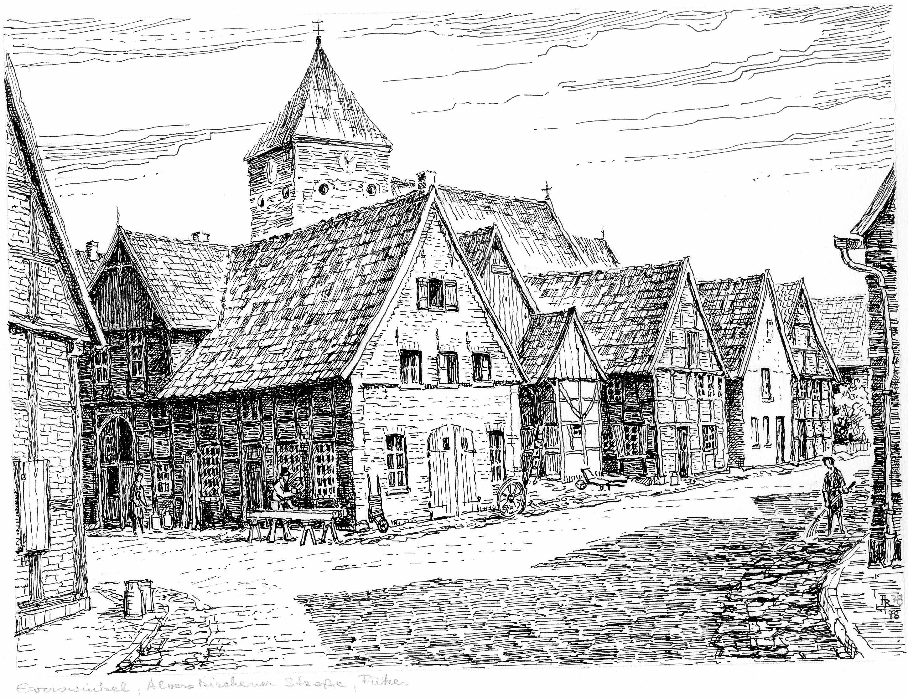 Die früheren Fachwerkhäuser an der Ecke Nordstraße/Vitusstraße, Ansicht von der Alverskirchener Straße Federzeichnung, 1978