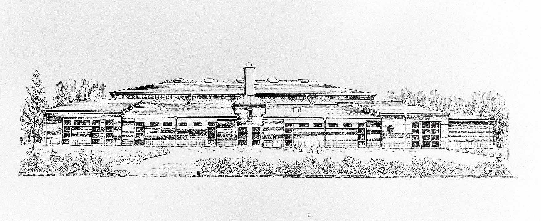 Die Kehlbachhalle an der Alverskirchener Straße dargestellt zur Eröffung der Sporthalle Federzeichnung, 1991