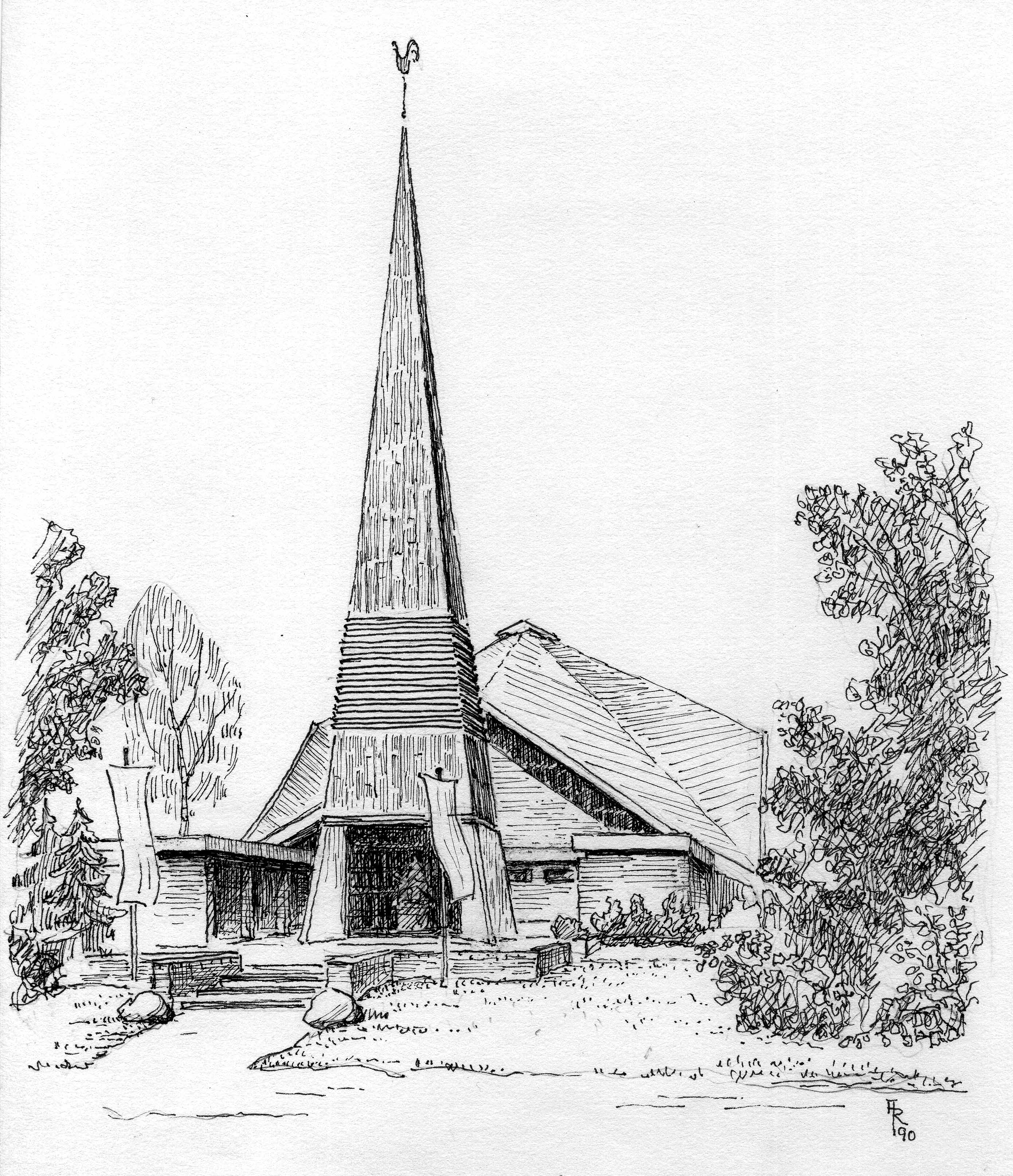 Die Kraftfahrerkapelle St. Christophorus in Raestrup, die zur Kirchengemeinde St. Clemens in Telgte gehört. Federzeichnung, 1990