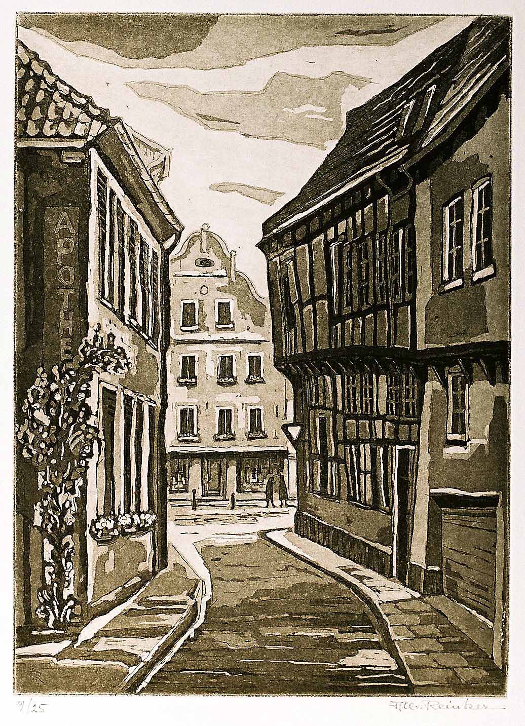 Altstadtgasse in Warendorf, Ansicht von der Fleischhauerstraße zum Markt Aquatinta–Radierung, 1987, 30 x 20 cm