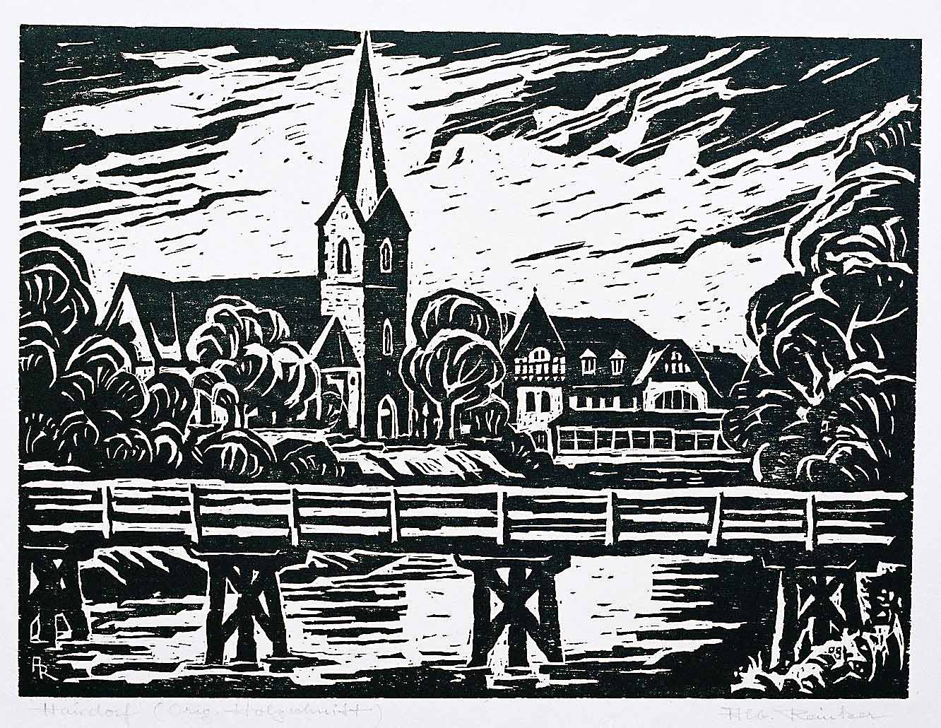 Ortsansicht von Handorf mit der Brücke der Sudmühlenstraße über die Werse und der St. Petronilla–Kirche im Hintergrund, rechts das frühere Hotel Vennemann Holzschnitt, Druckgröße 48 x 36 cm, 1973