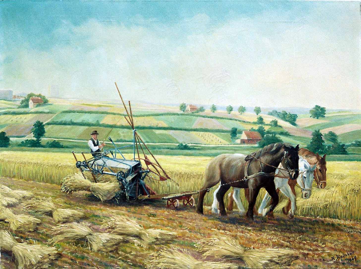 Getreideernte in den 1940er Jahren mit dem patentierten Selbstbinder der Firma Gebr. Lohmann Öl auf Leinwand, 100 x 72 cm, 1948