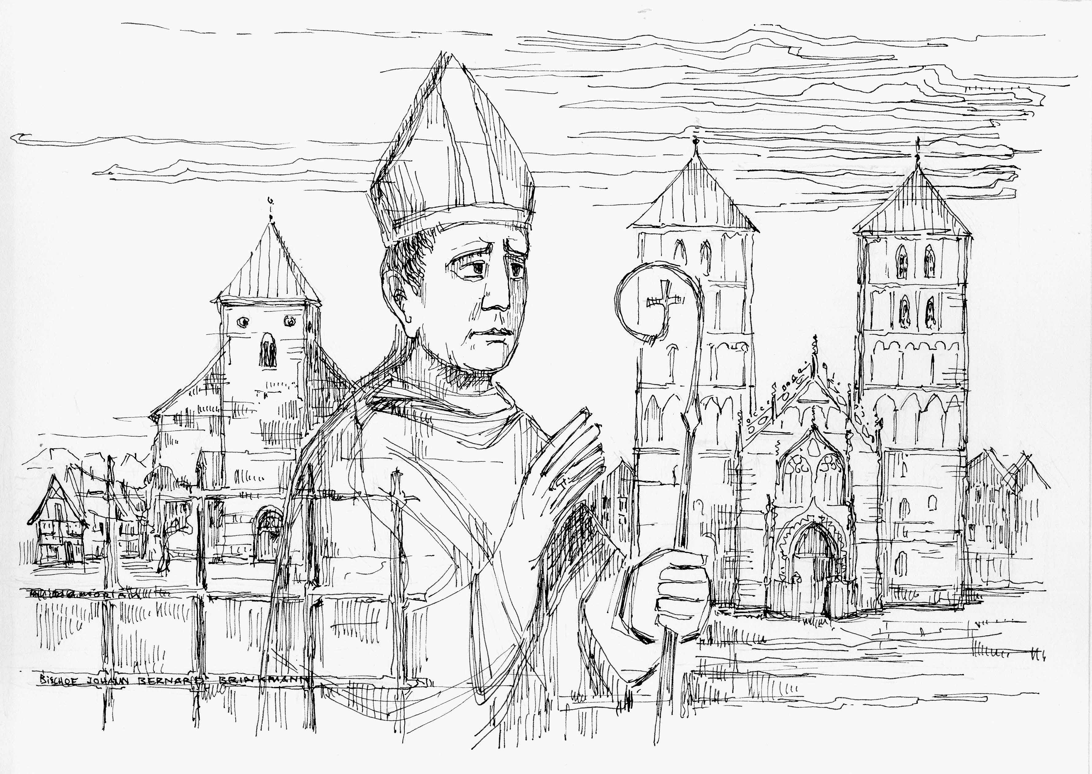 Bischof Johann Bernhard Brinkmann dargestellt mit Bildern seines Lebensweges: Dem Geburtshaus, der Taufkirche, Gitterstäben und der Bischofskirche Federzeichnung