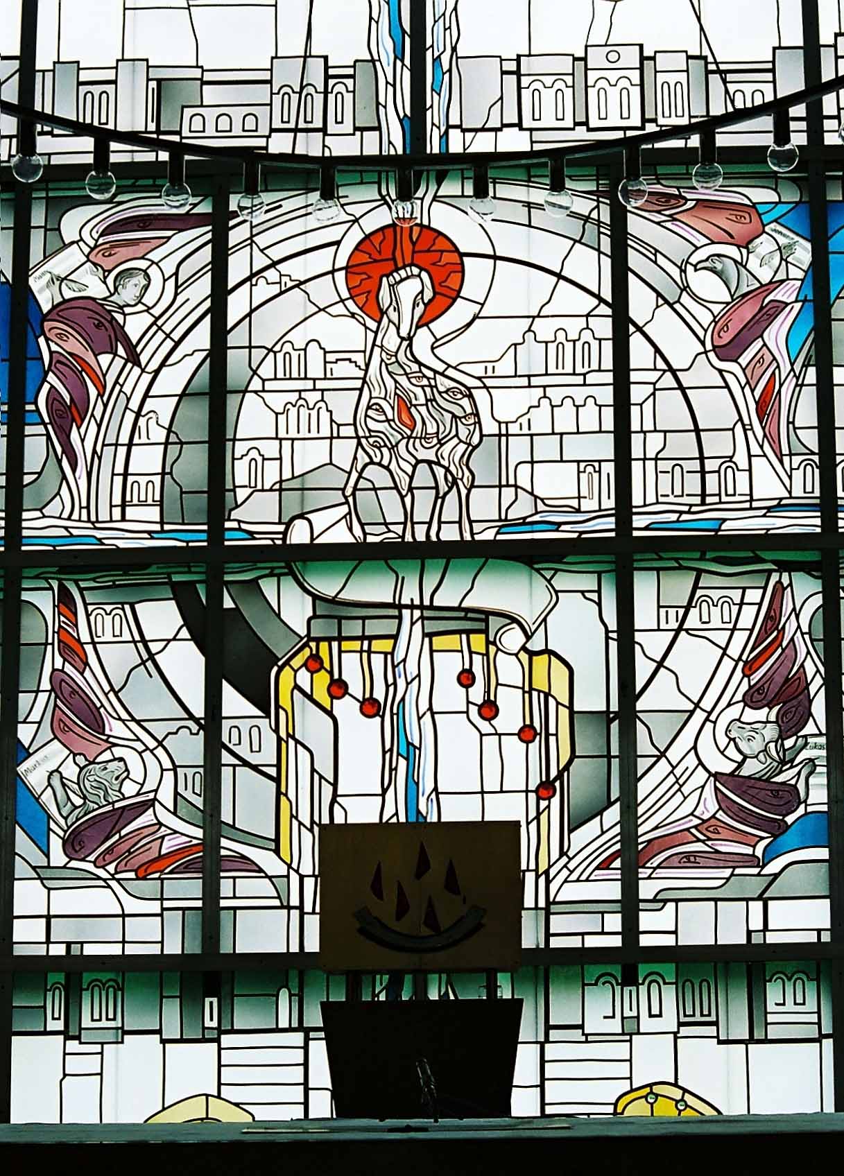 Detail: Das himmlische Jerusalem nach der geheimen Offenbarung, dargestellt im Fensterbild im Altarraum der Kirche in Peine/Vöhrum. Ausschnitt in der Mitte. Fensterbild, 1991