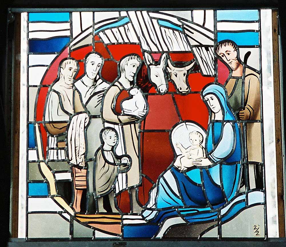 In den vier Fenstern werden Ereignisse aus dem Leben Marien dargestellt. Das obere und das untere Feld beziehen sich jeweils auf das Thema des mittleren Feldes.