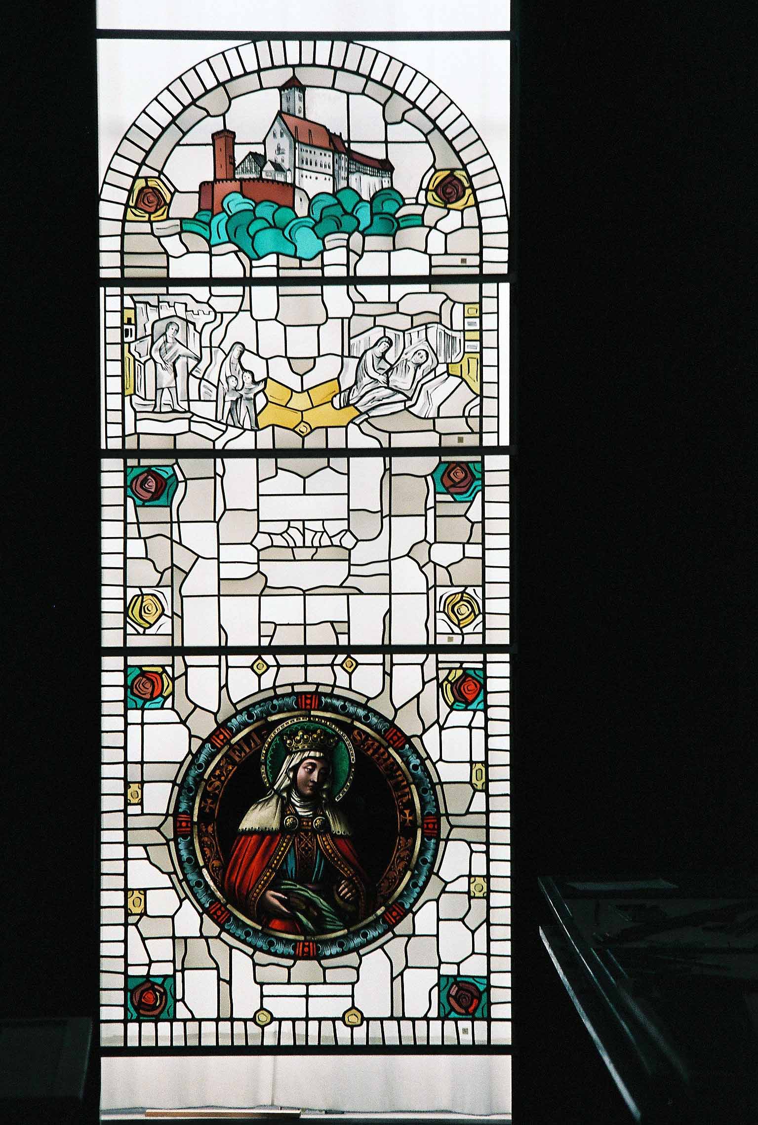 Die hl. Elisabeth. Ein Medaillon aus einem früheren Kirchenfenster wird durch Motive aus dem Leben der hl. Elisabeth äußerlich und inhaltlich erweitert. Das Fenster zeigt die Wartburg, Vertreibung von der Burg, die Betreuung von Kranken und Hilfsbedürftigen und das Rosenwunderexterner Link ⇒ Wikipedia...