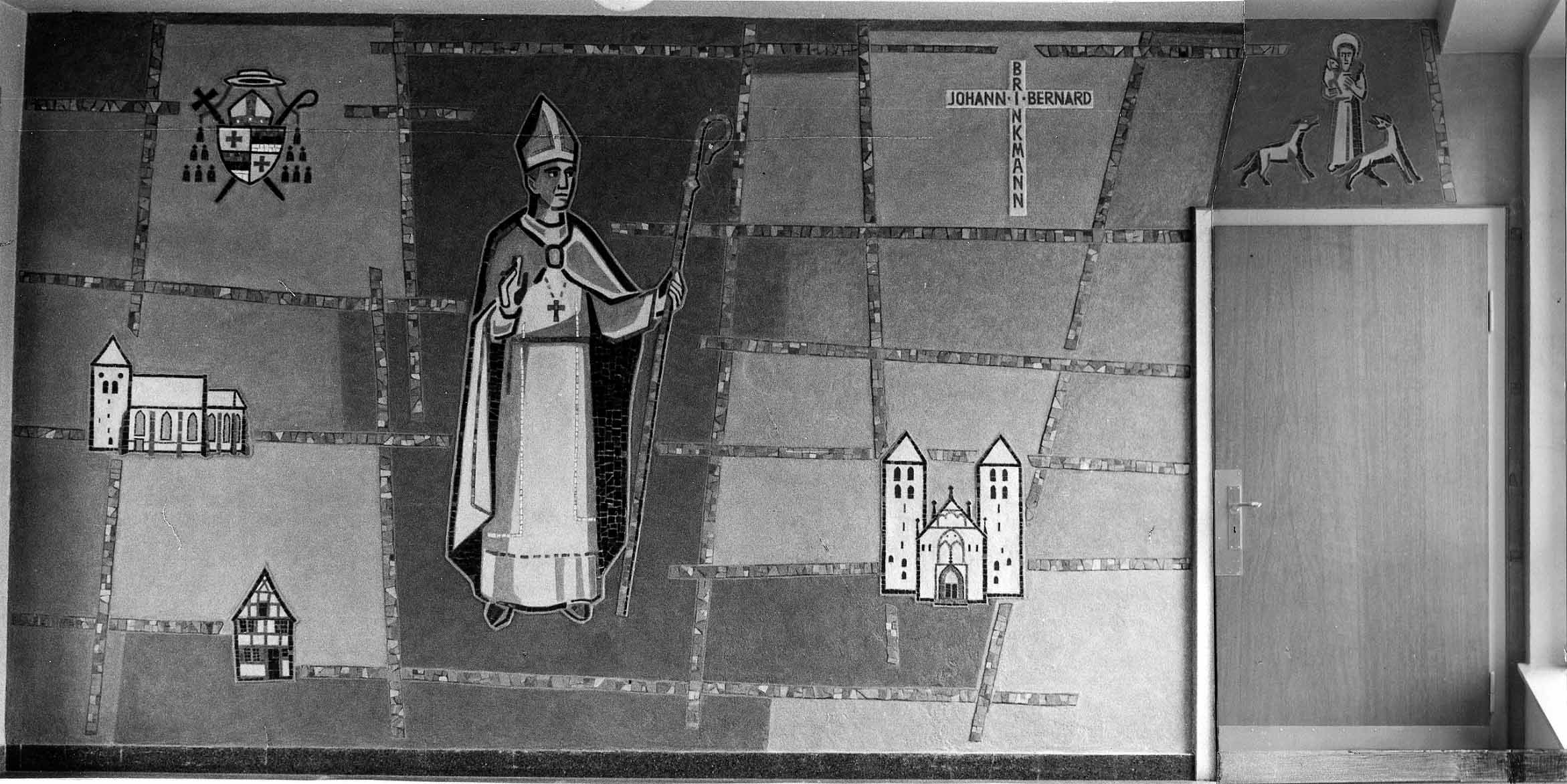 Der Bischof Johann Bernard Brinkmann und Motive aus seinem Leben, dargestellt als Putzmosaik in der Johann–Bernard–Brinkmann–Schule (heute Grundschule) im Pausenraum der Schule.