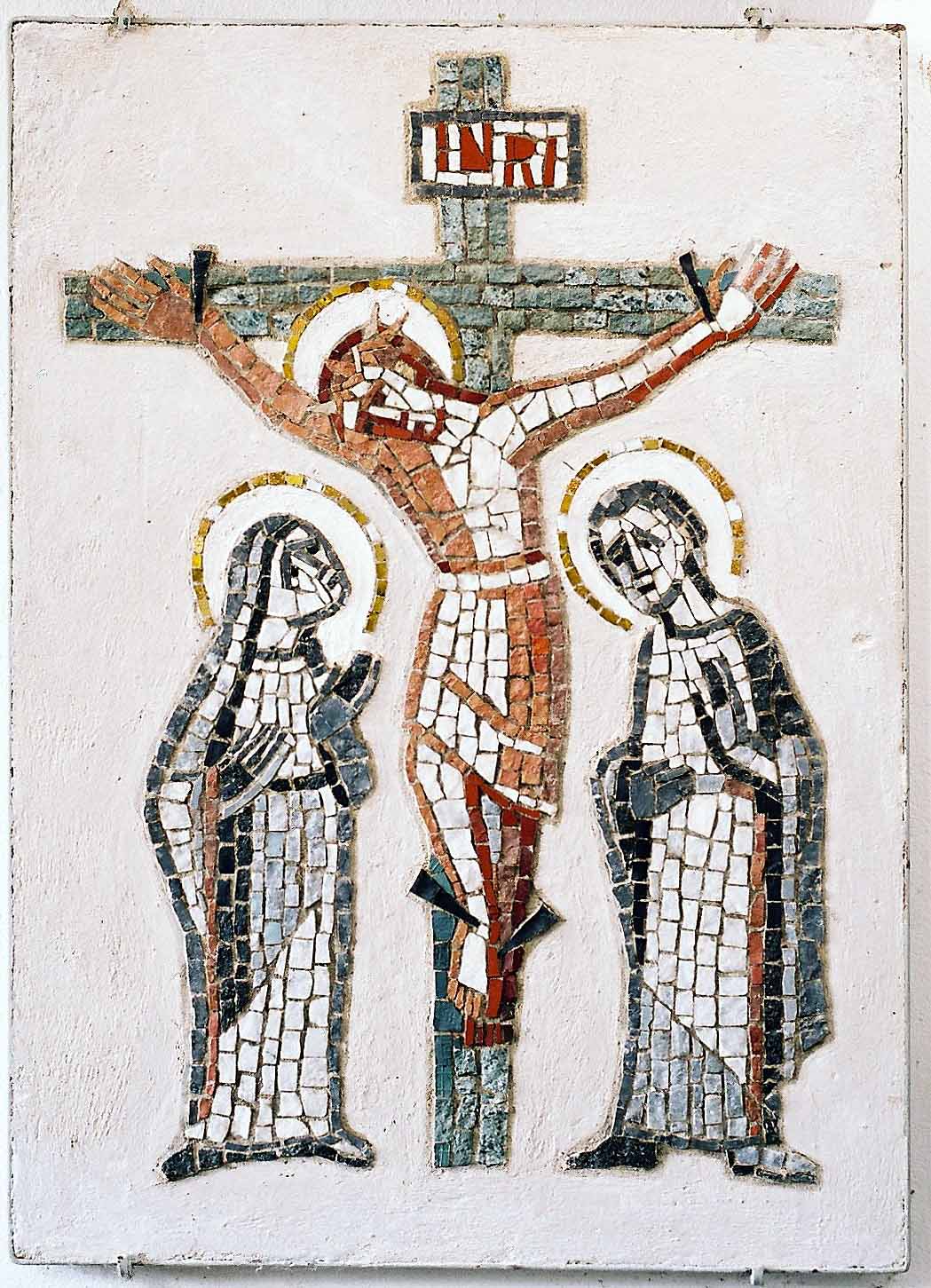 Der erste Kreuzweg. Die 14 Mosaikbilder aus Natursteinen wurden in die Wand der Kirche ohne Umrahmung eingesetzt. Die Darstellungen sind auf das Wesentliche des Geschehens reduziert.