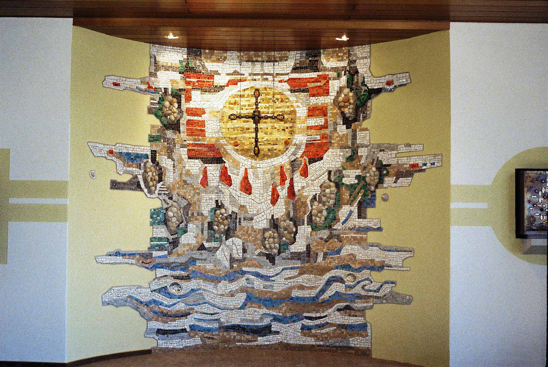 Die frühere Kapelle wurde zu einem Meditationsraum umgestaltet. Das Mosaikbild besteht aus Glas– Marmor– und Kieselsteinen und einigen Südseemuscheln.