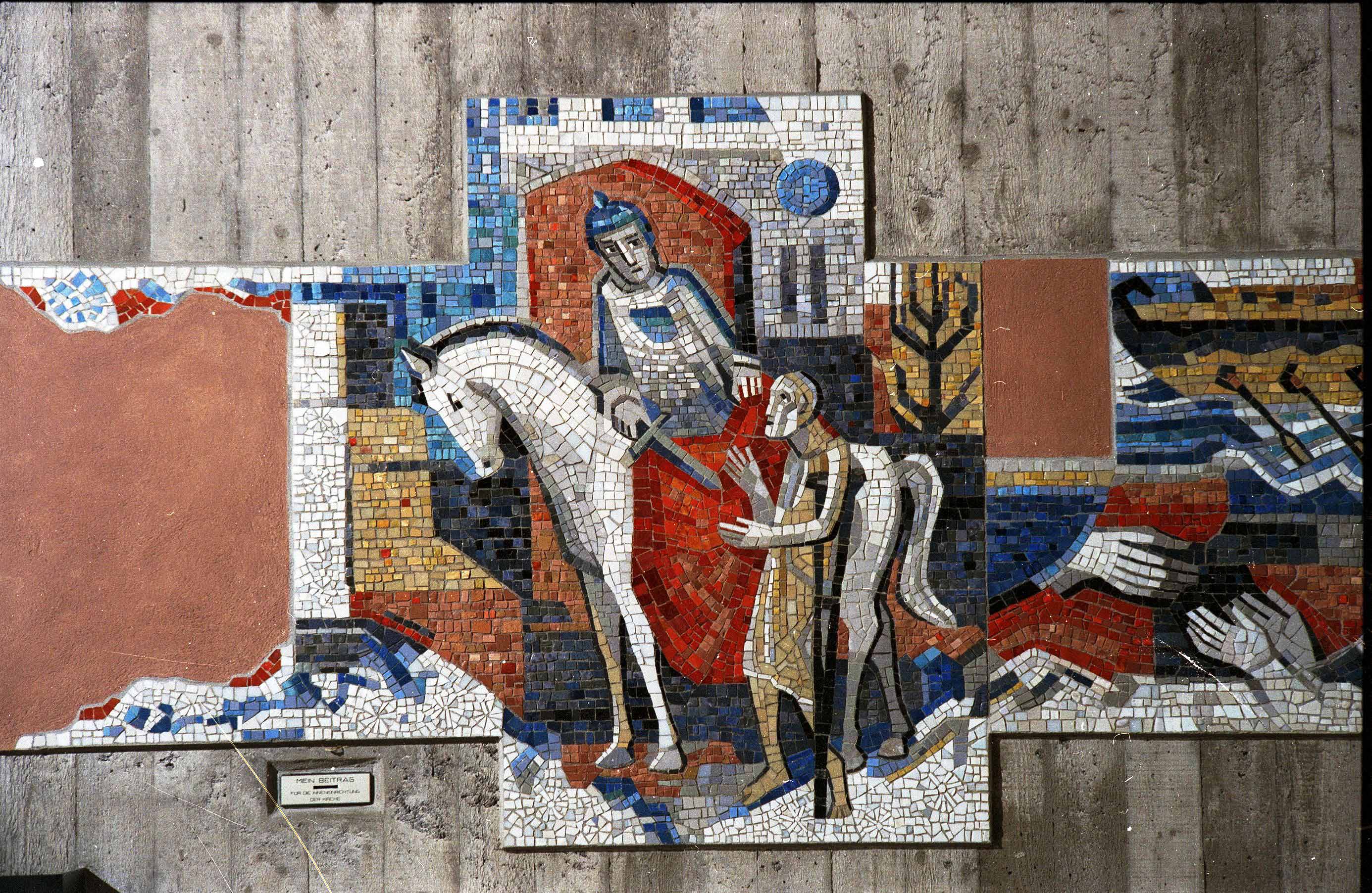 Wandmosaik in der St.–Elisabeth–Kirche in Salzgitter–Lebenstedt. Linke Hälfte. Technik, Größe, Jahrgang