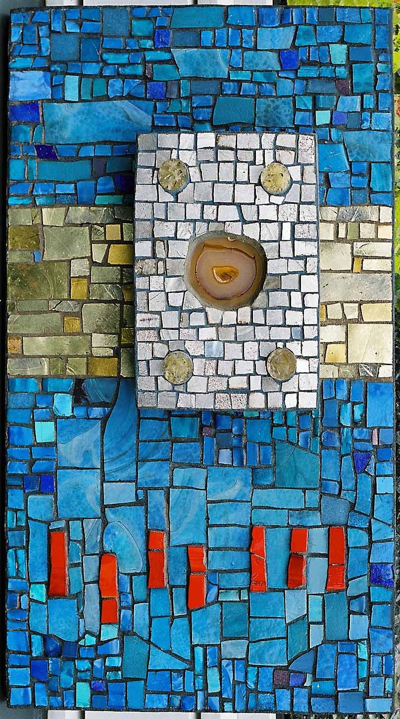 Himmlischer Thron. Achatscheibe durchbrochen auf Silberplatte durch Glasstäbe vorgerückt. Grundfläche blau mit roten Steinen (Feuerflammen) in unterer Fläche besetzt. Mosaik