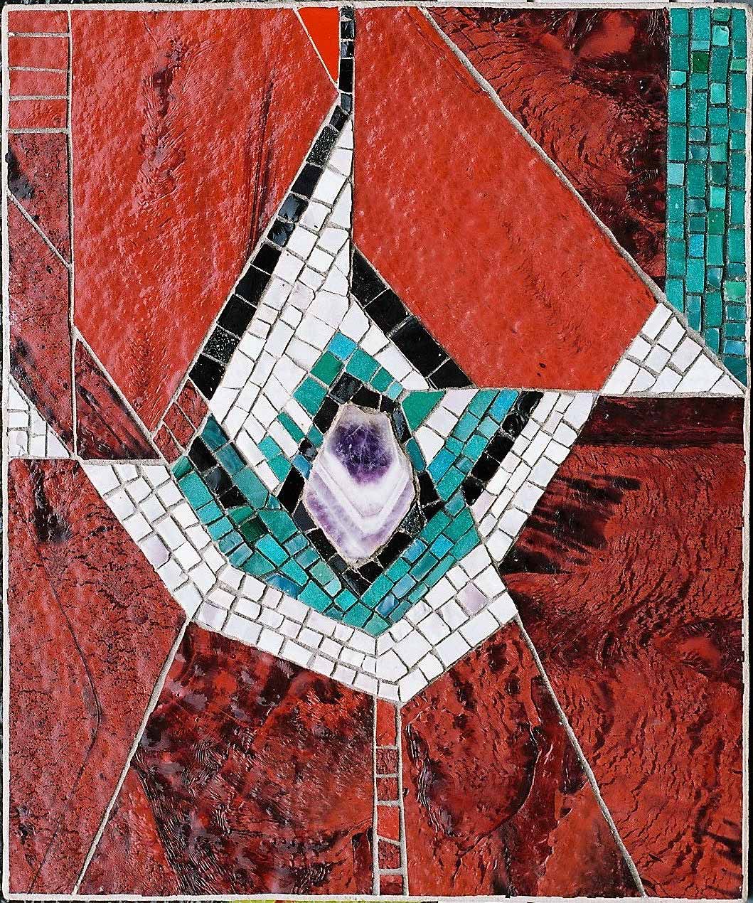 Amethyst in Tropfenform, eingebunden in rötlich–erdiger Grundfläche