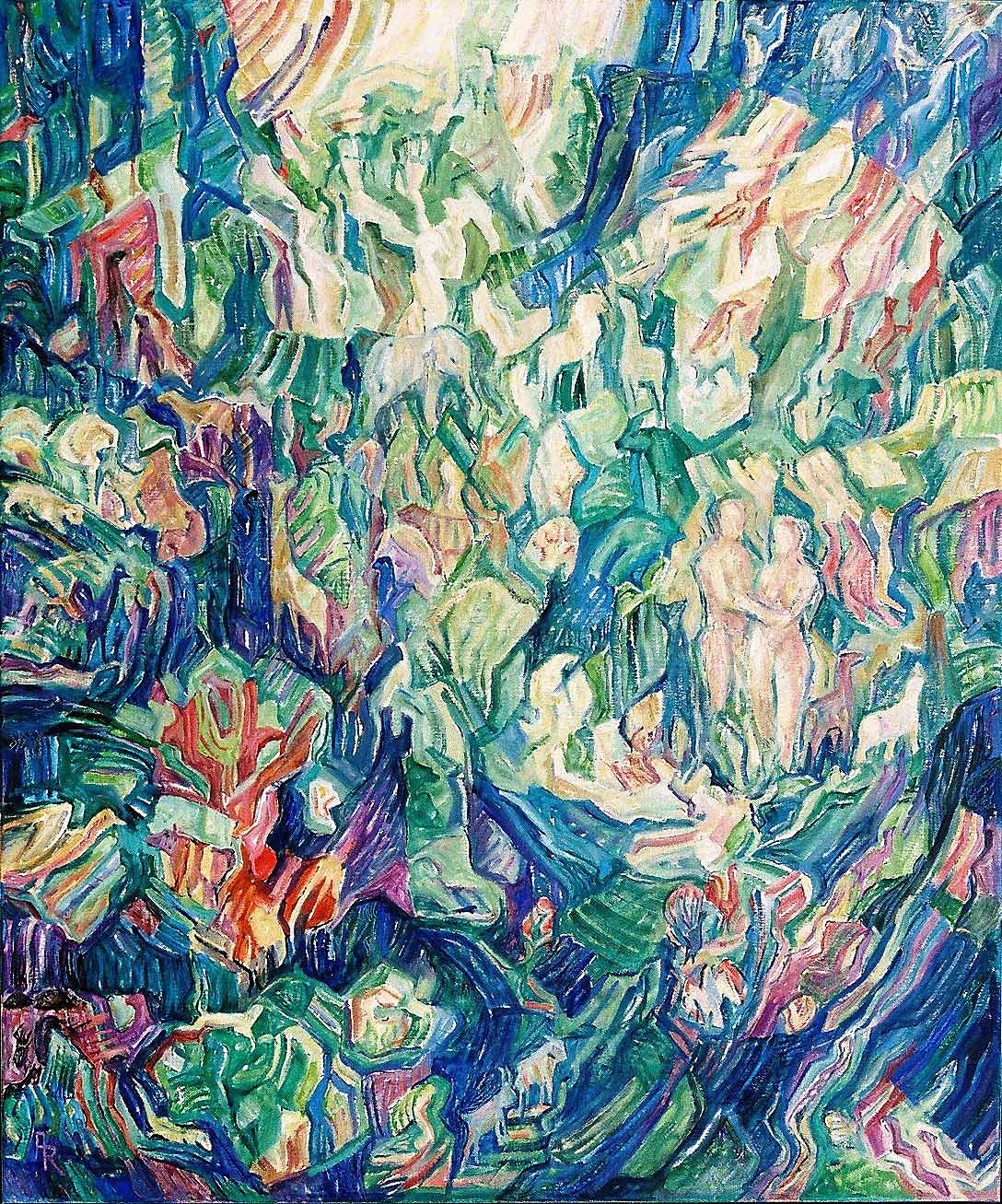 Die sieben Tage der Schöpfung, sechster Tag: Erschaffung der Pflanzen und Tiere und der Menschen. Acryl auf Leinwand, Größe, Jahrgang